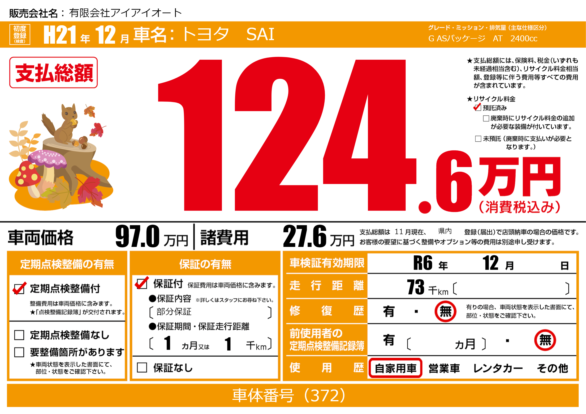 | 車名 | トヨタ SAI | グレード ミッション 排気量 |