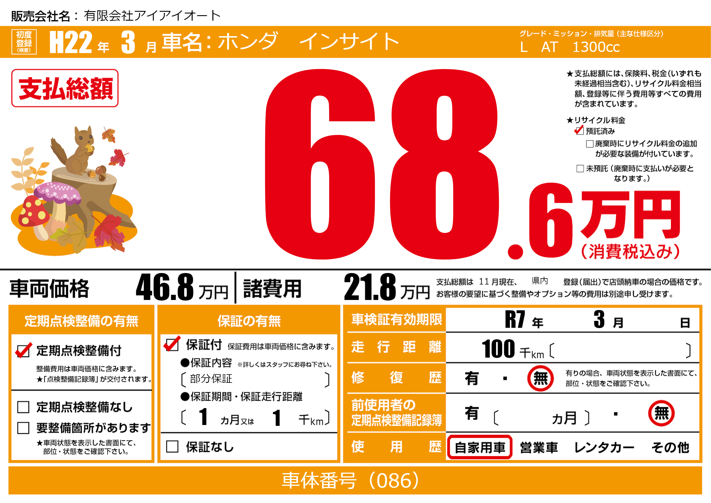 | 車名 | ホンダ インサイト | グレード ミッション 排気量 |