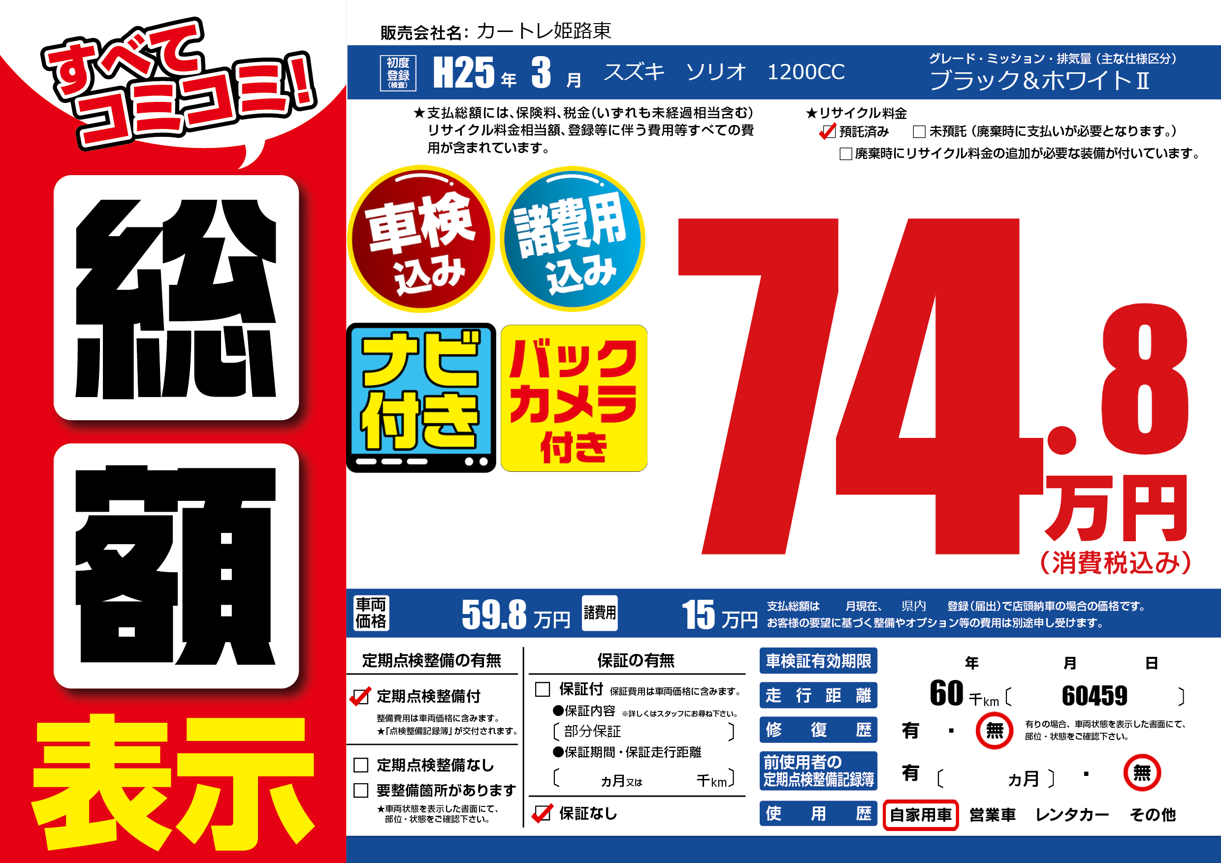 | 車名 | スズキ ソリオ 1200CC | グレード ミッション 排気量 |