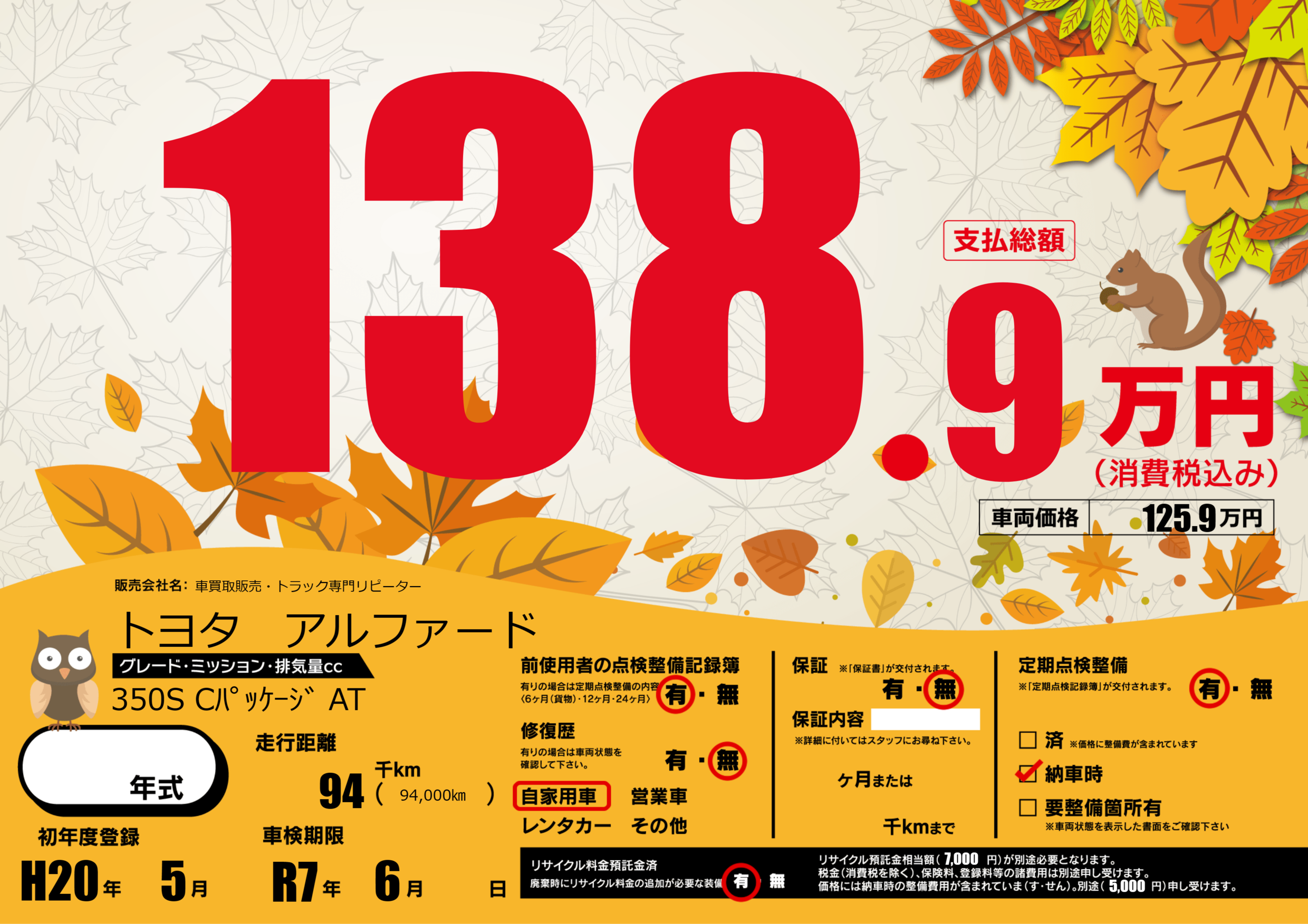 | 車名 | トヨタ アルファード | グレード ミッション 排気量 |