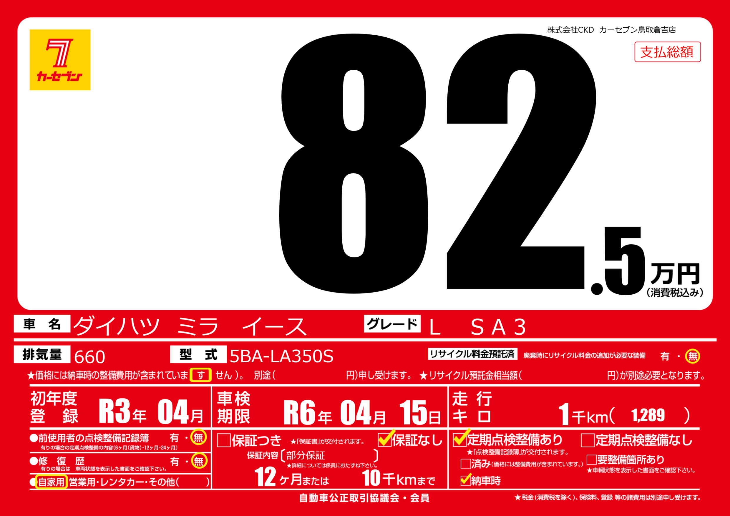 | 車名 | ダイハツ ミラ イース | グレード ミッション 排気量 |