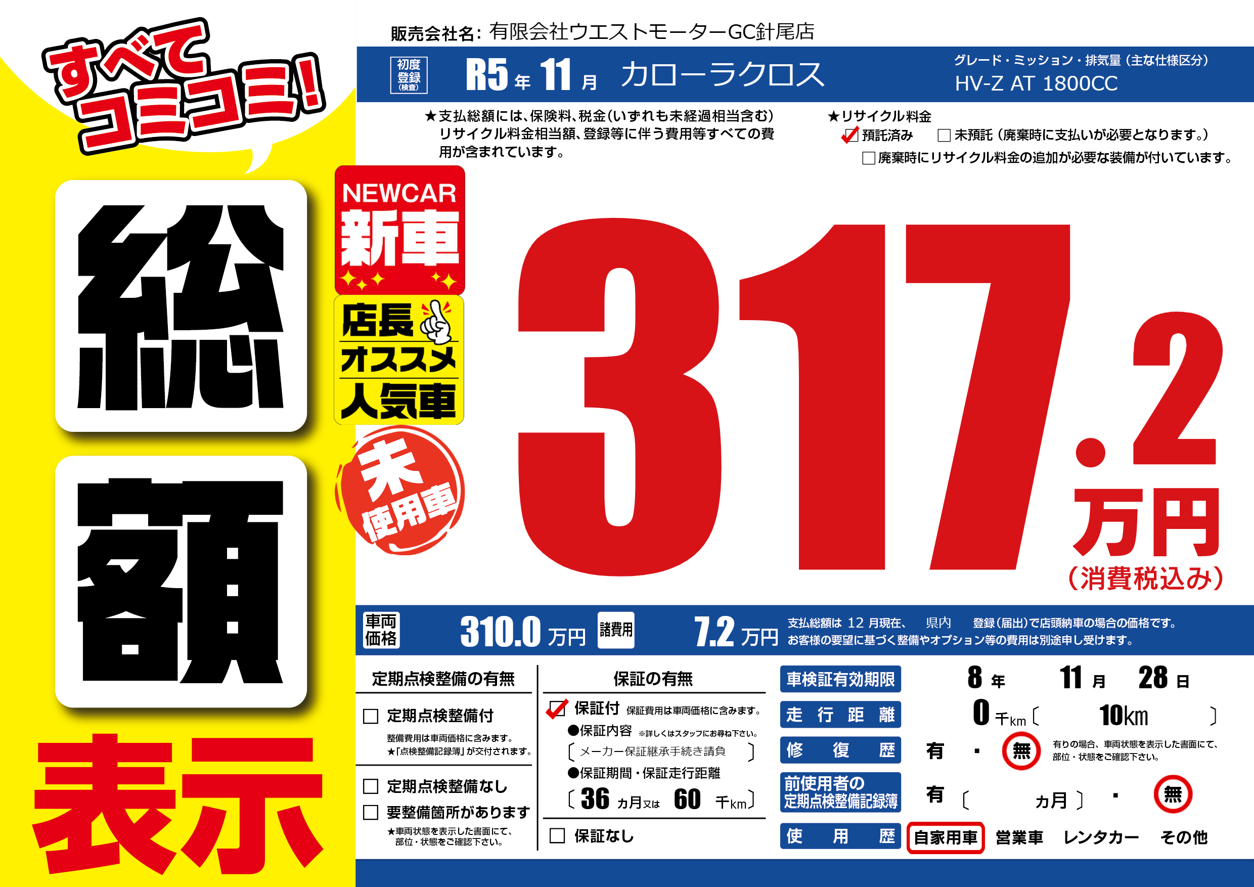 | 車名 | カローラクロス | グレード ミッション 排気量 |