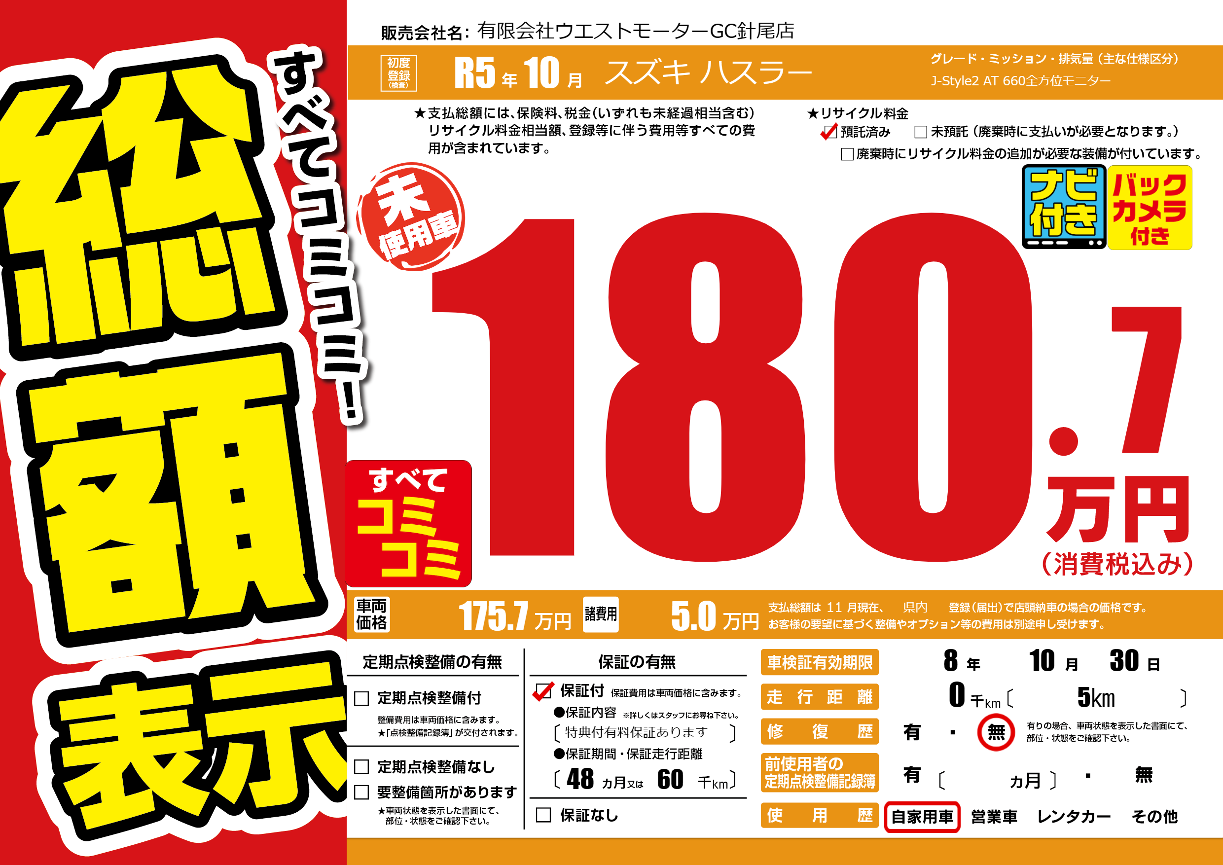 | 車名 | スズキ ハスラー | グレード ミッション 排気量 |