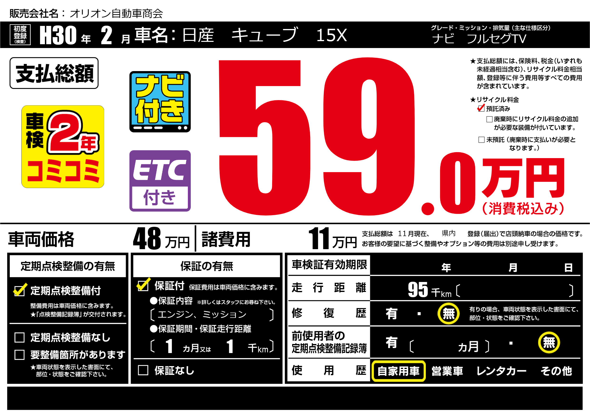 | 車名 | 日産 キューブ 15X | グレード ミッション 排気量 |