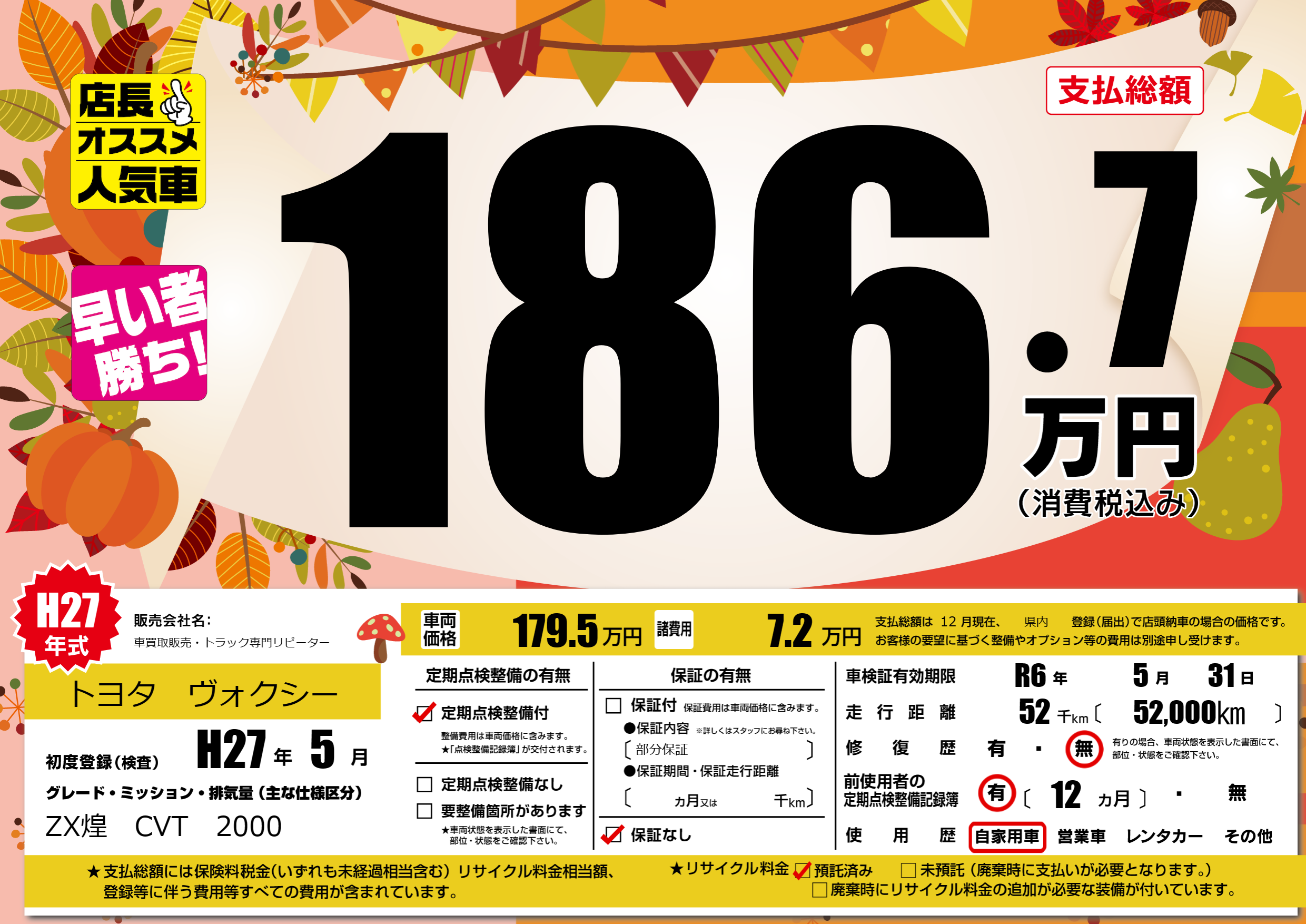 | 走行キロ | 5.2万km | 初年度登録 | H27年5月 |