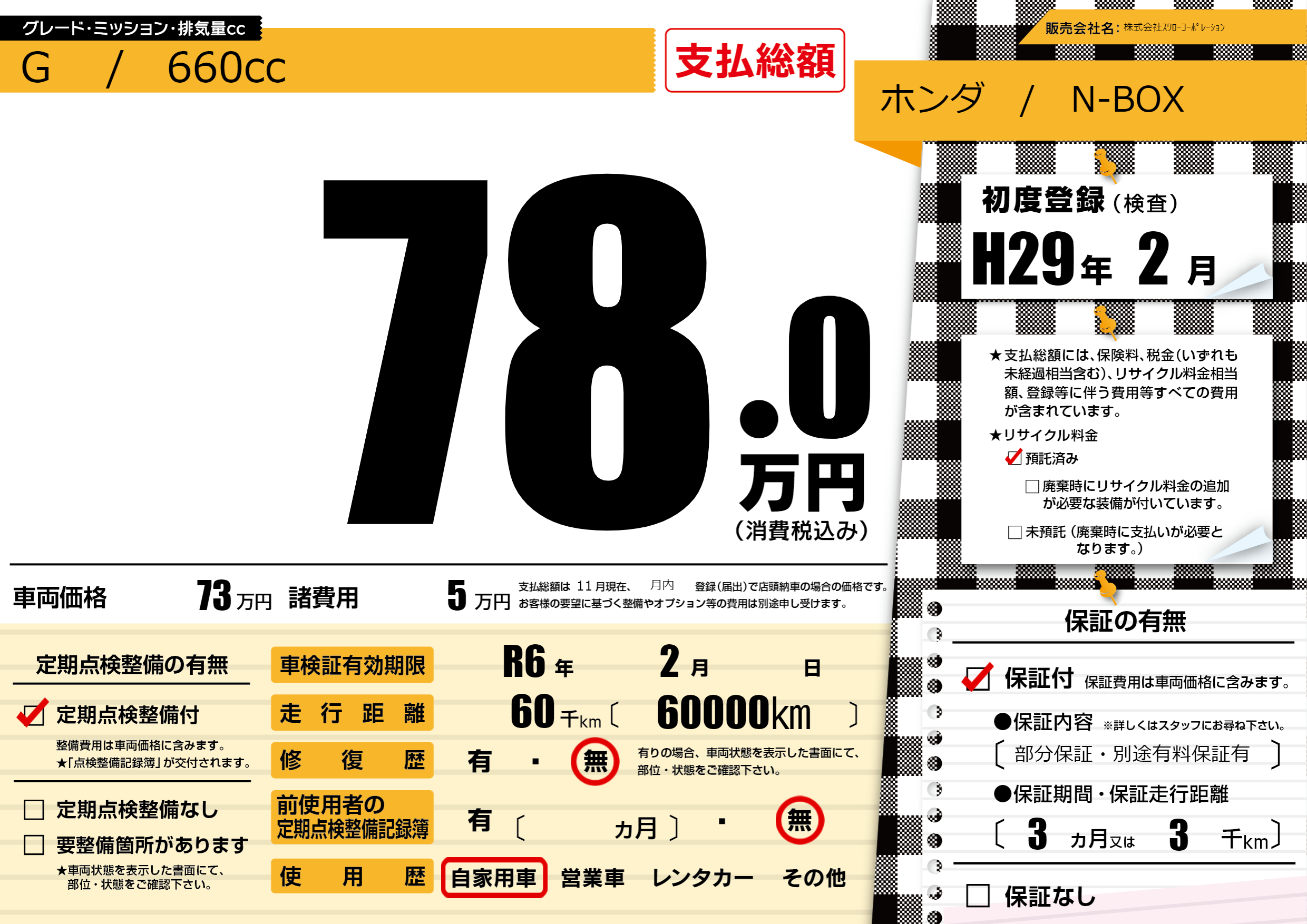 | 車名 | ホンダ / N-BOX | グレード ミッション 排気量 |