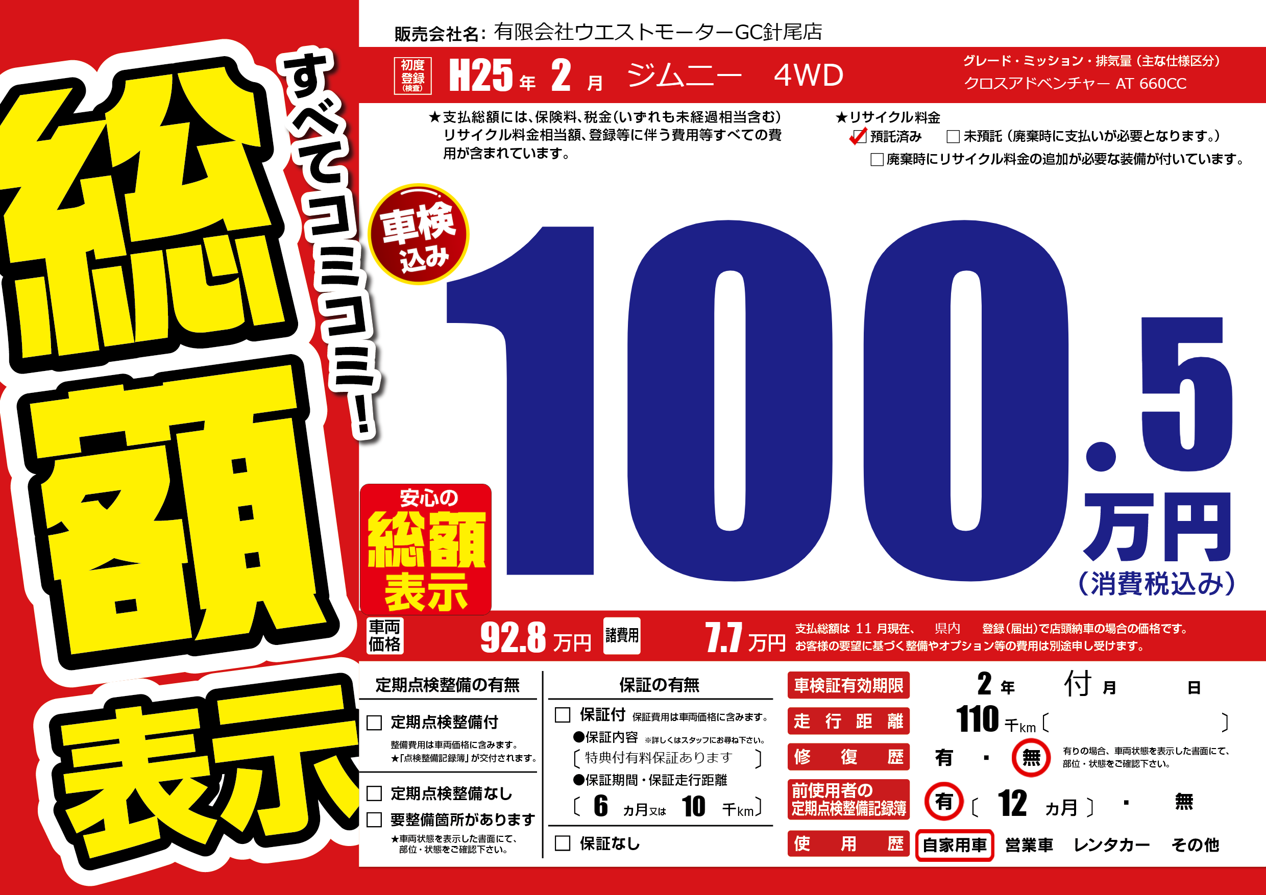 | 車名 | ジムニー 4WD | グレード ミッション 排気量 |