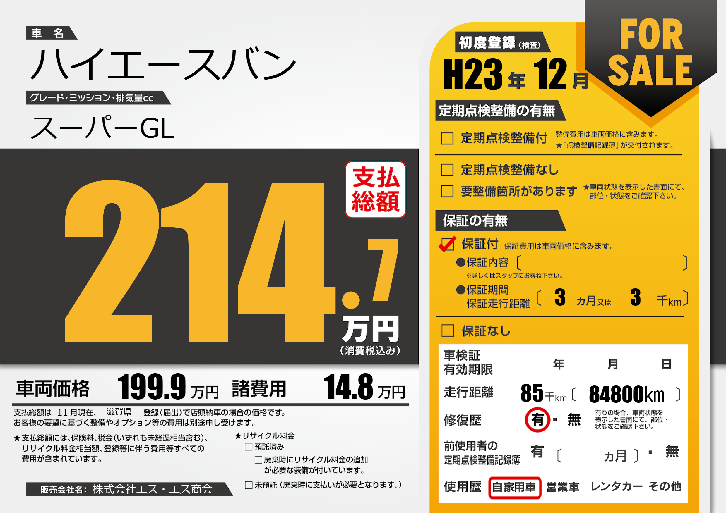 | 車名 | ハイエースバン | グレード ミッション 排気量 |
