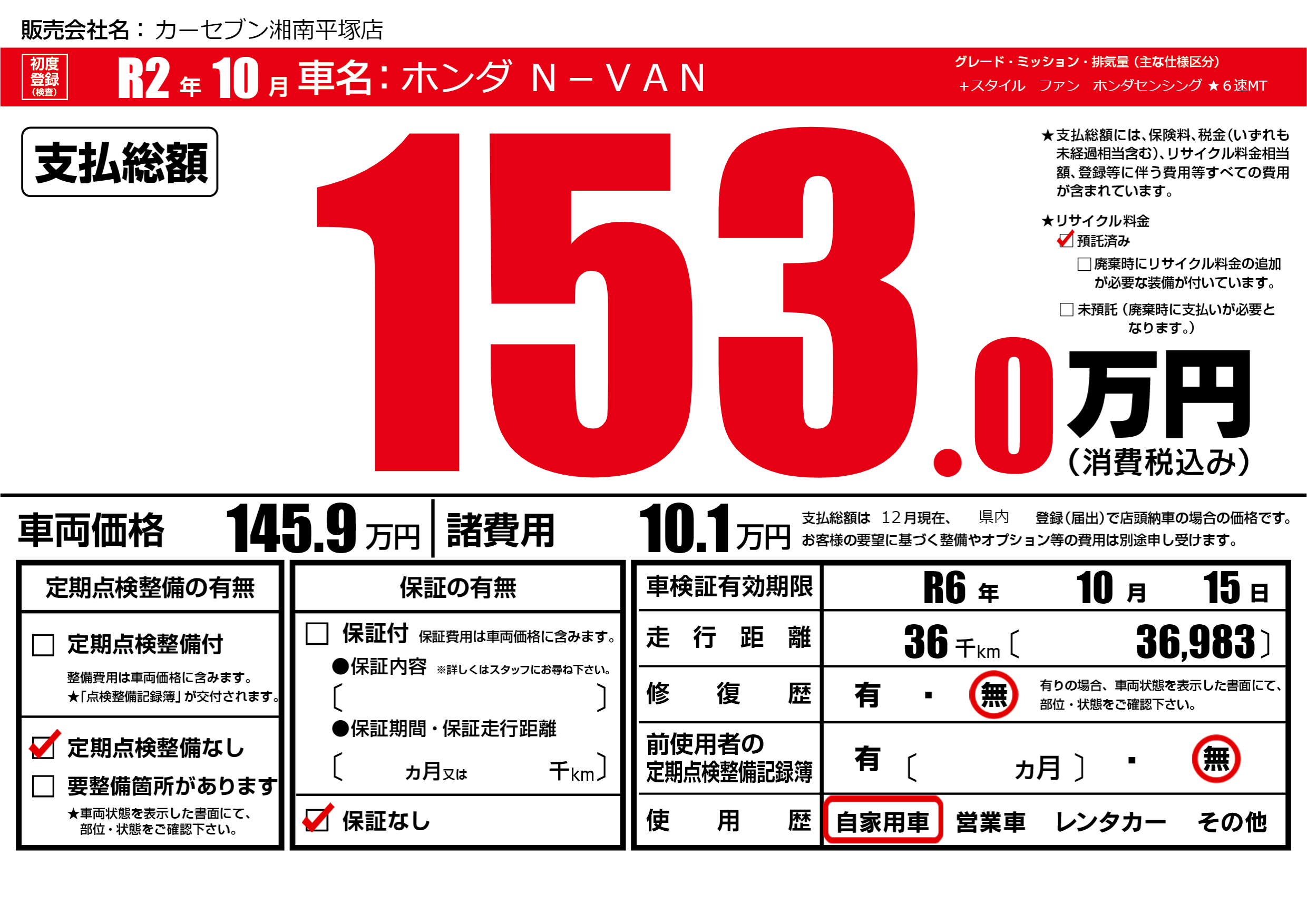 | 車名 | ホンダ N-VAN | グレード ミッション 排気量 |