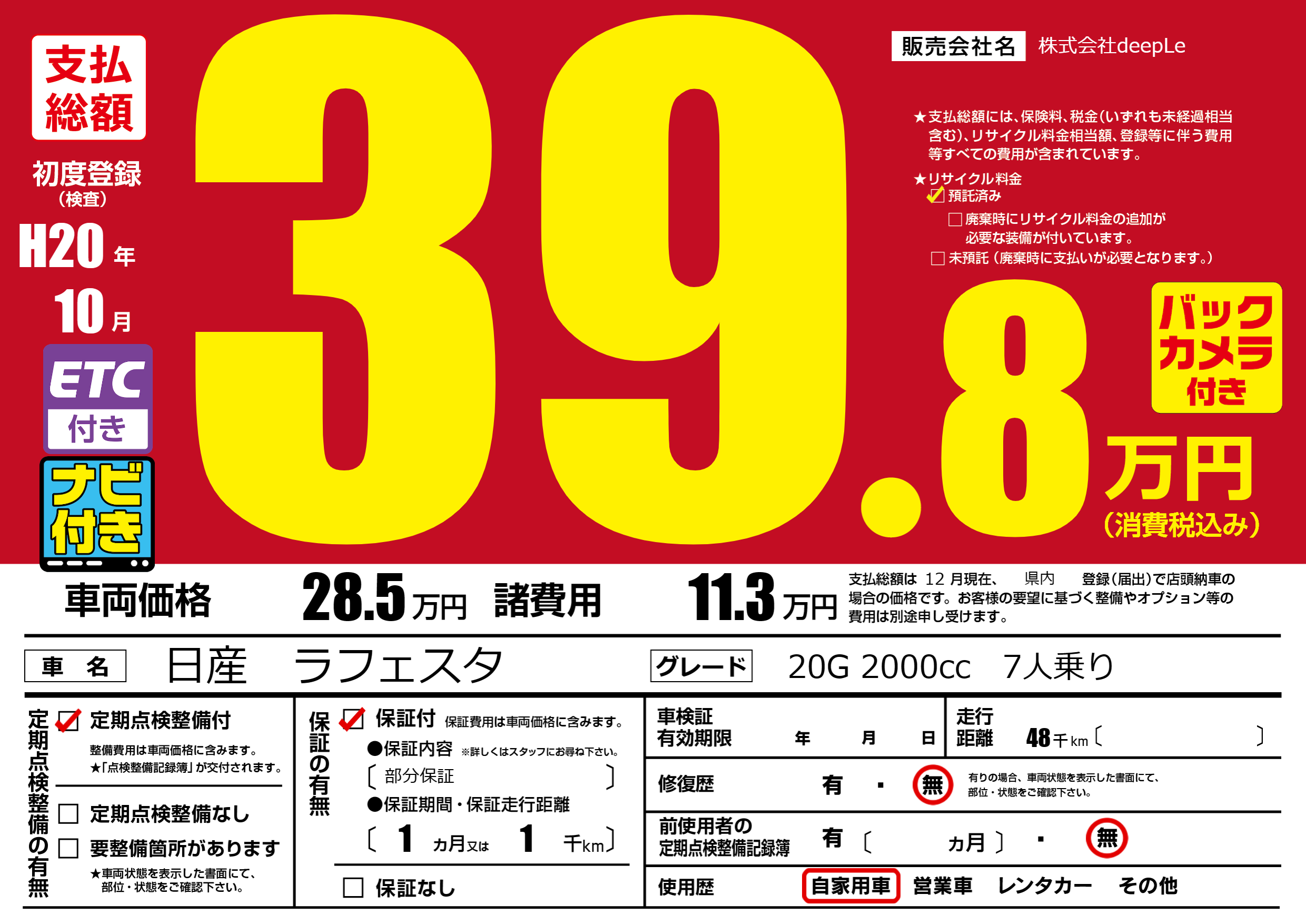 | 走行キロ | 4.8万km | 初年度登録 | H20年10月 |
