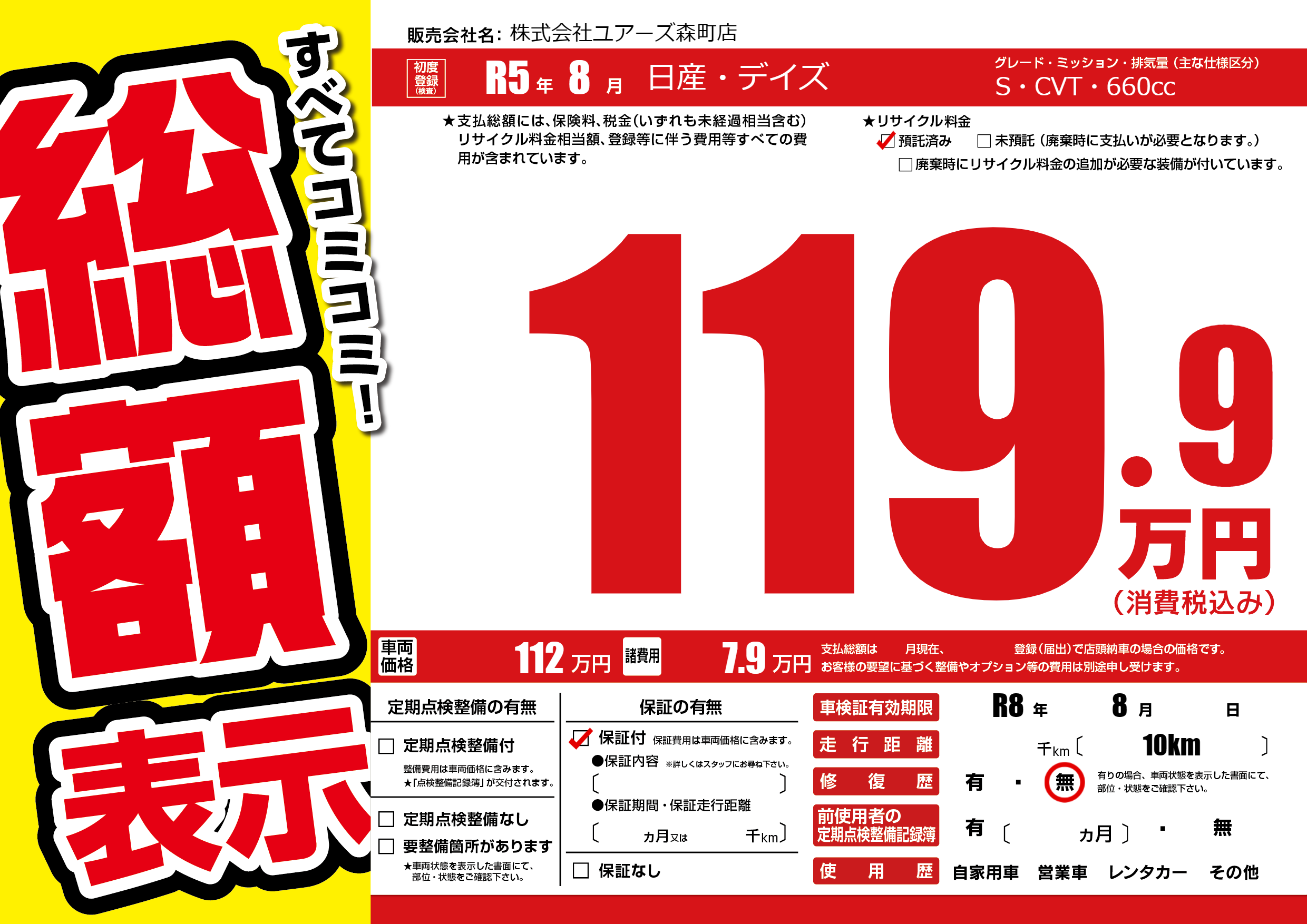 | 車名 | 日産・デイズ | グレード ミッション 排気量 |