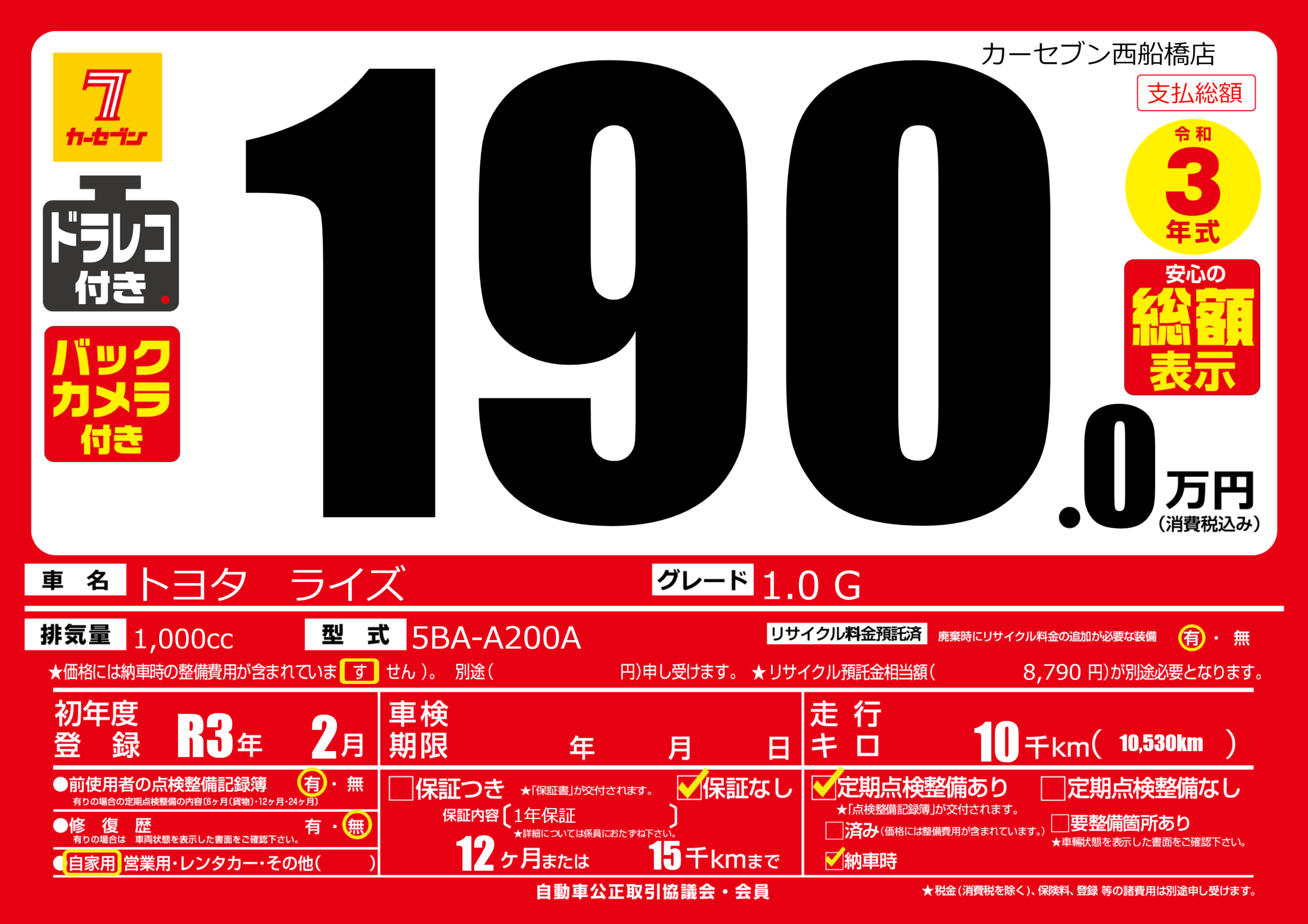 | 車名 | トヨタ ライズ | グレード ミッション 排気量 |