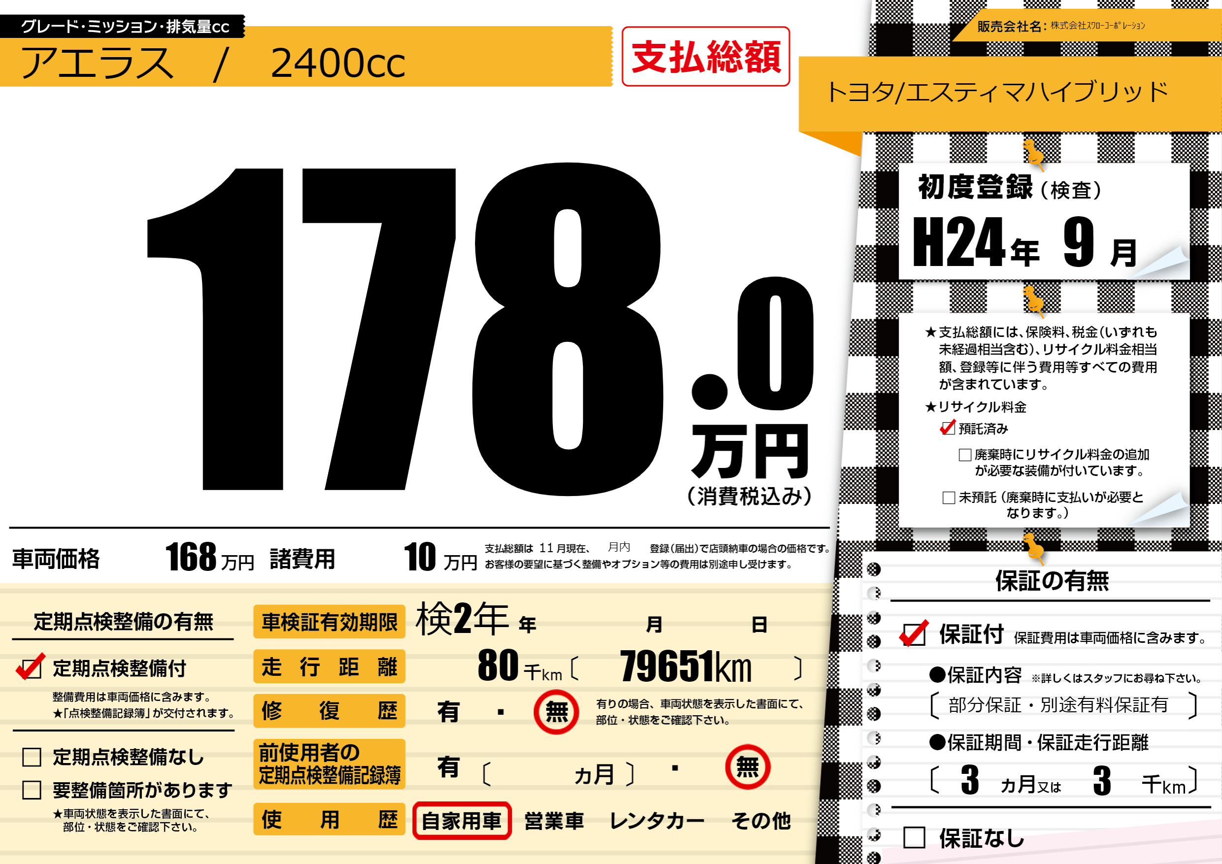 | 走行キロ | 8万km | 初年度登録 | H24年9月 |