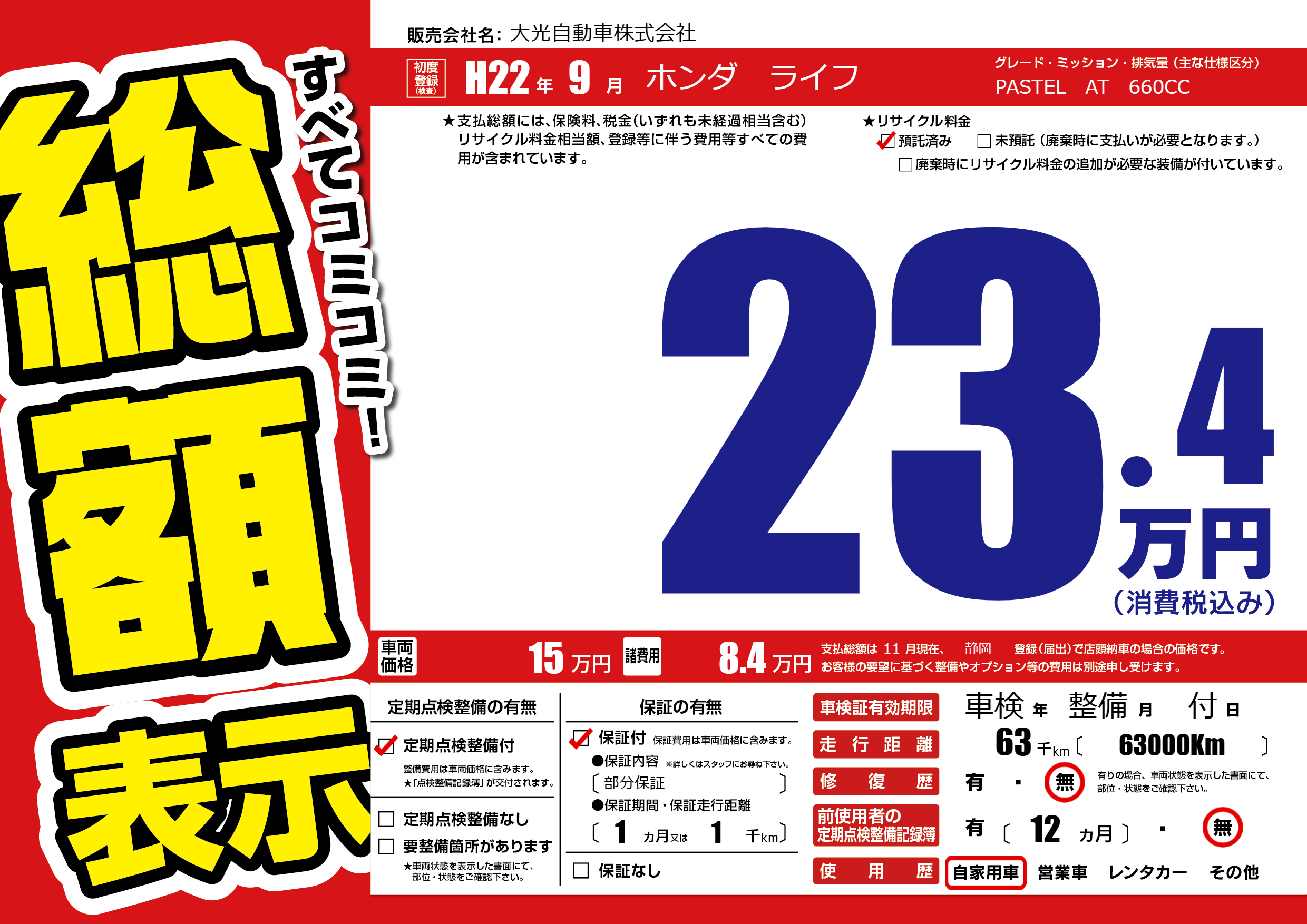 | 走行キロ | 6.3万km | 初年度登録 | H22年9月 |