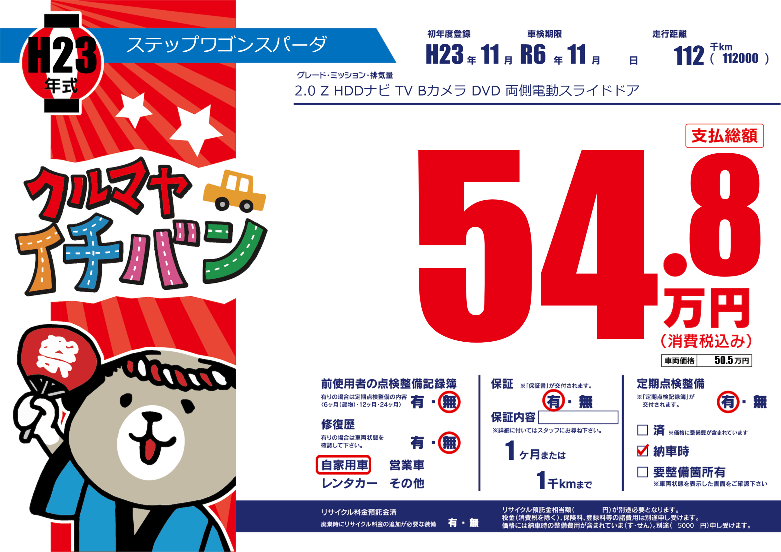 | 走行キロ | 11.2万km | 初年度登録 | H23年11月 |