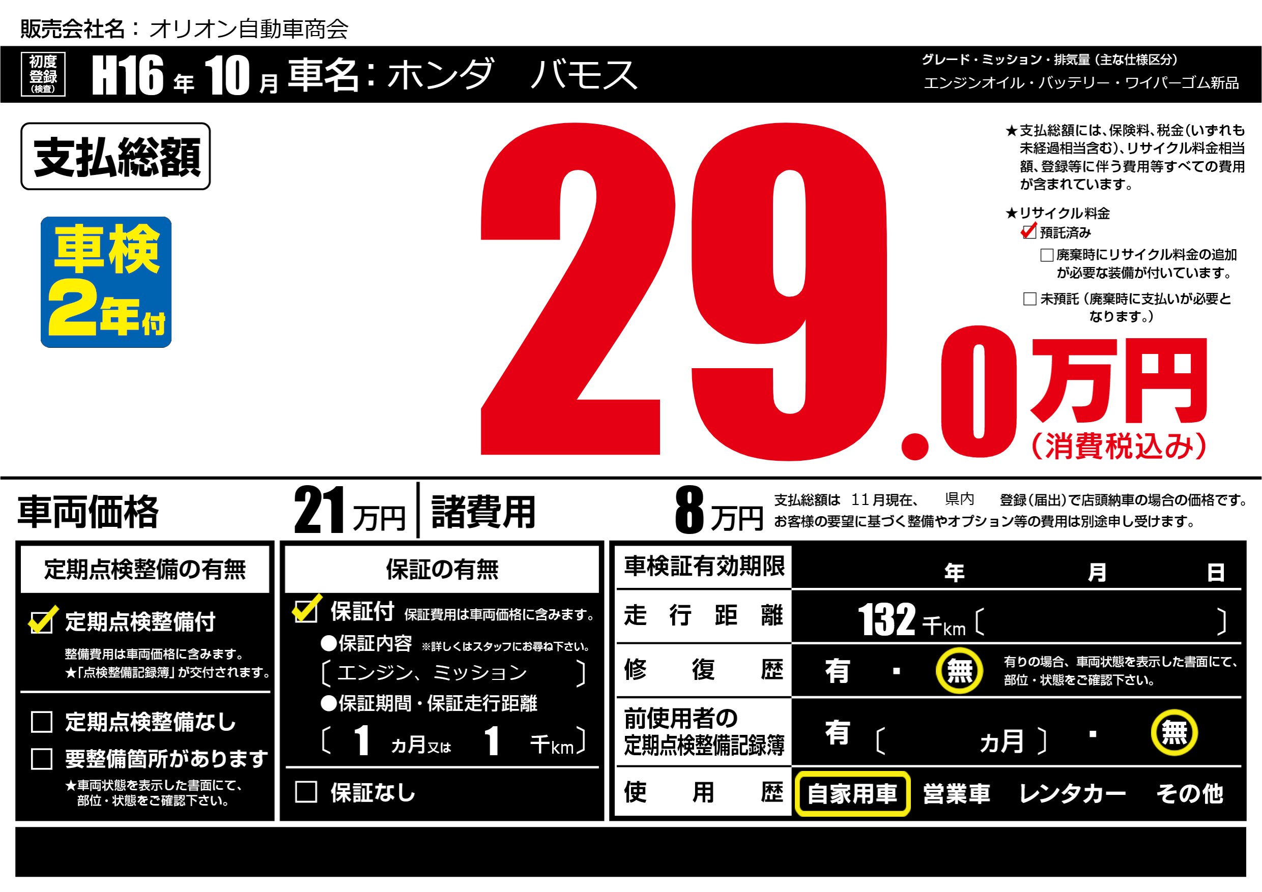 | 車名 | ホンダ バモス | グレード ミッション 排気量 |