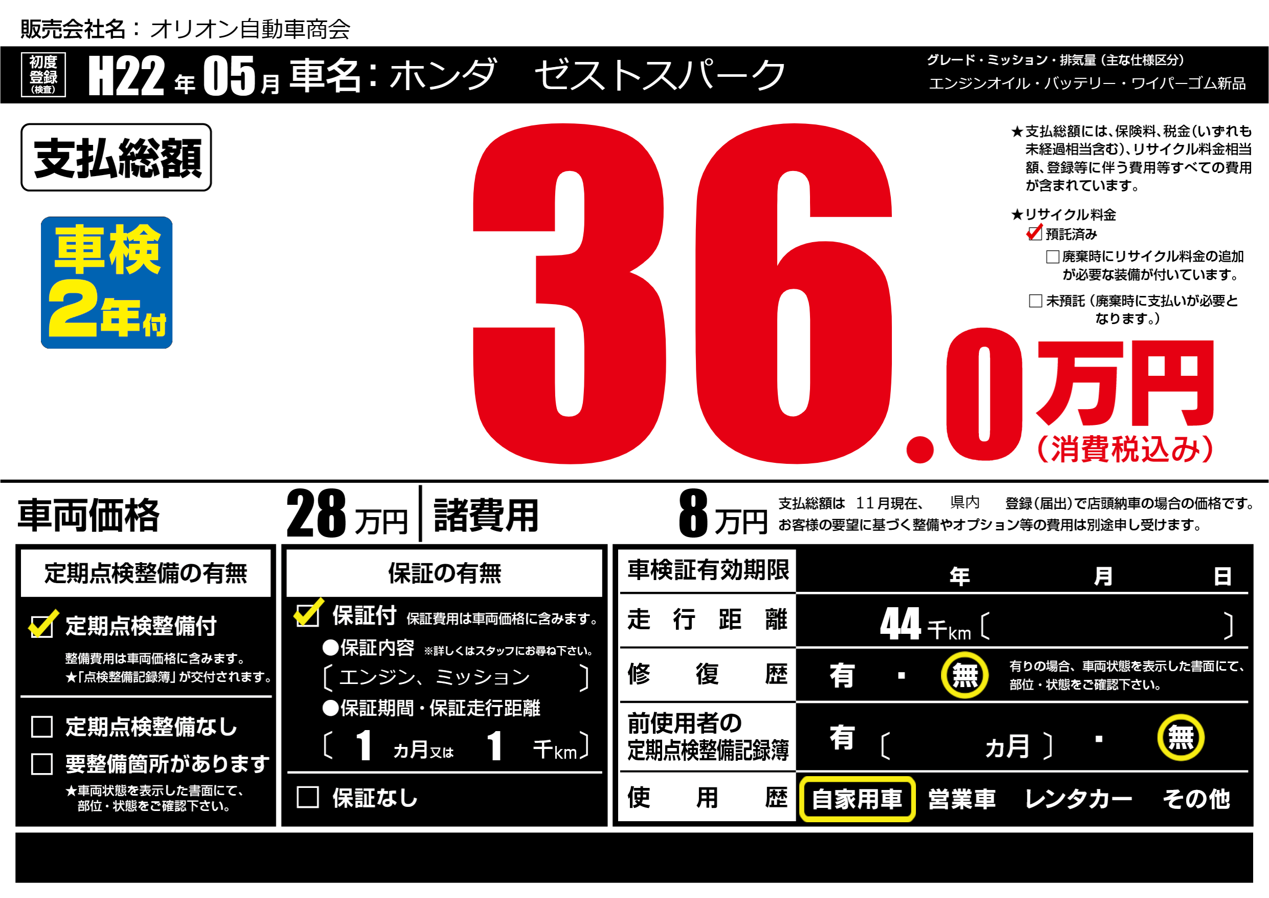 | 車名 | ホンダ ゼストスパーク | グレード ミッション 排気量 |