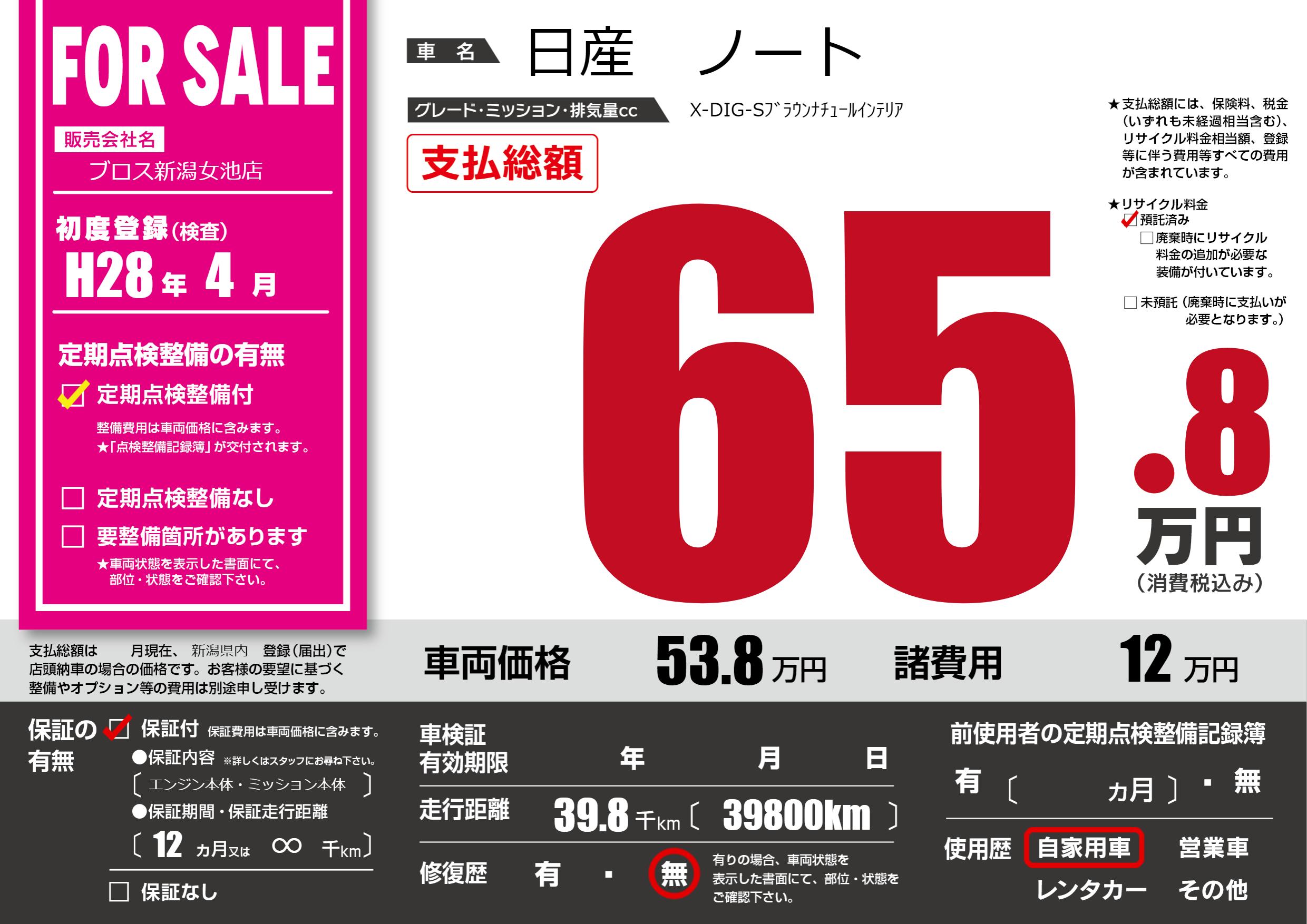 | 車名 | 日産 ノート | グレード ミッション 排気量 |