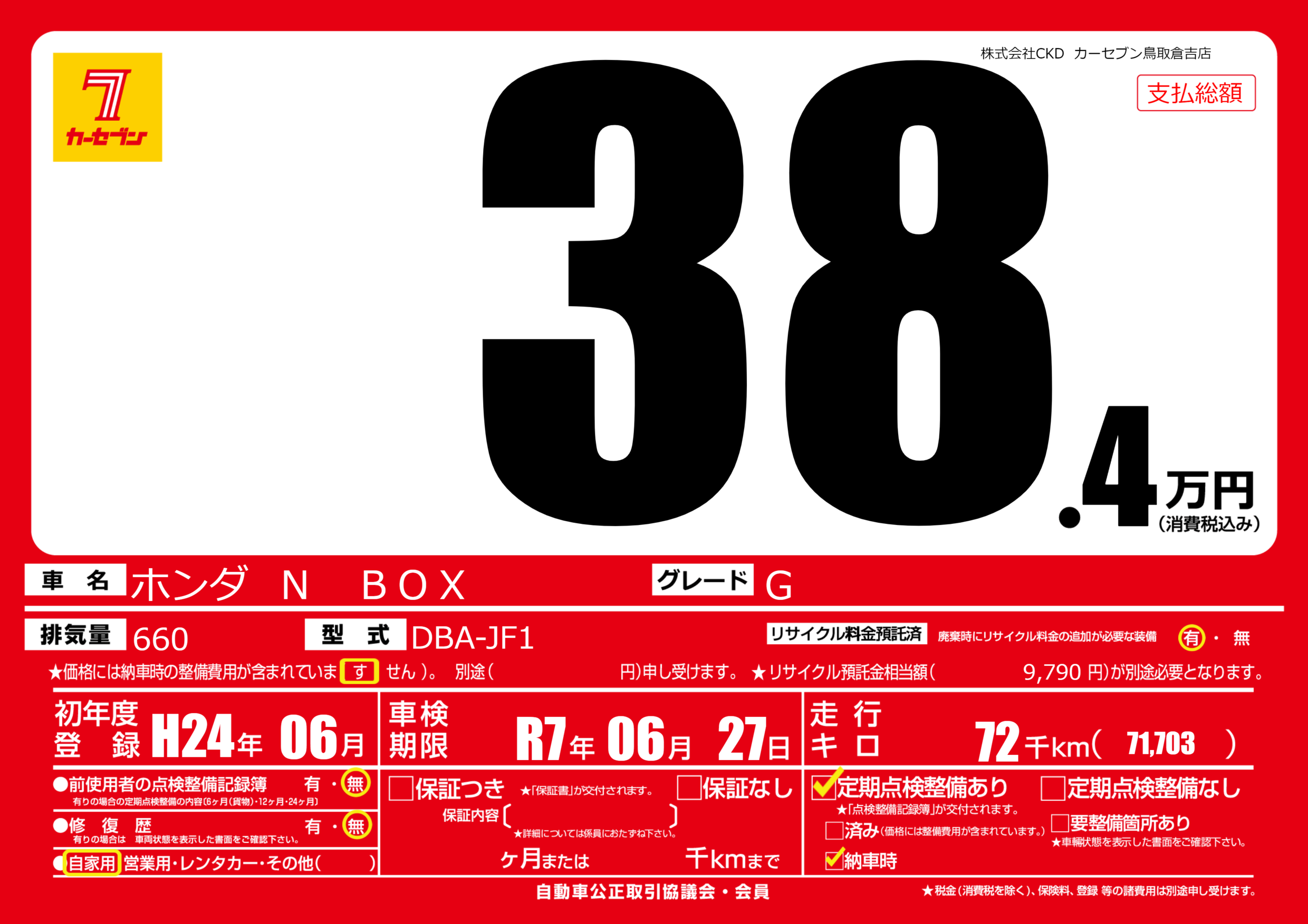 | 車名 | ホンダ N BOX | グレード ミッション 排気量 |