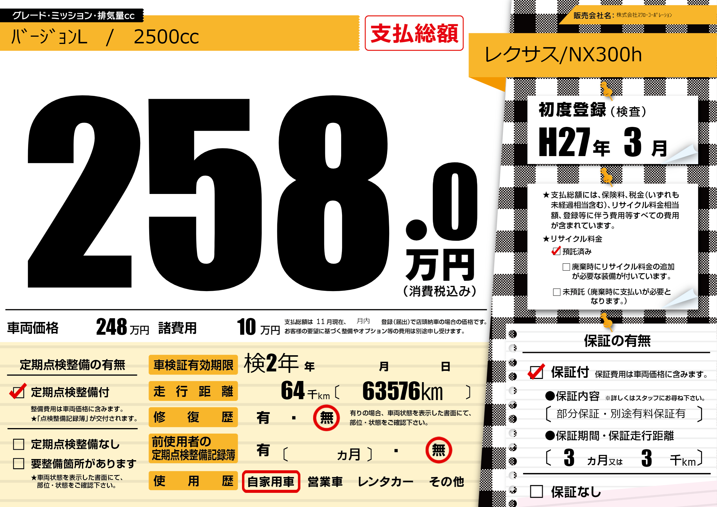 | 車名 | レクサス/NX300h | グレード ミッション 排気量 |