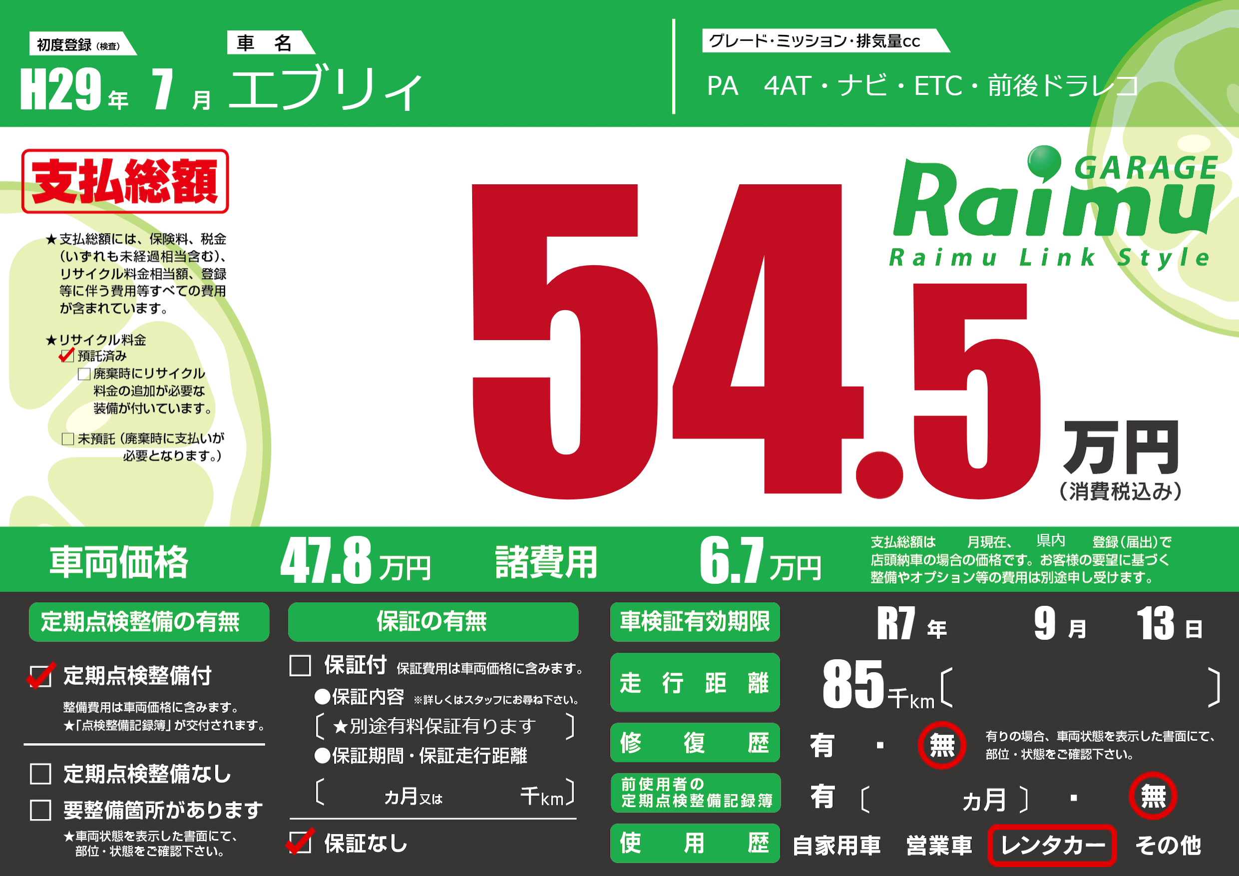 なし | 車検制限 | R7年9月13月 |