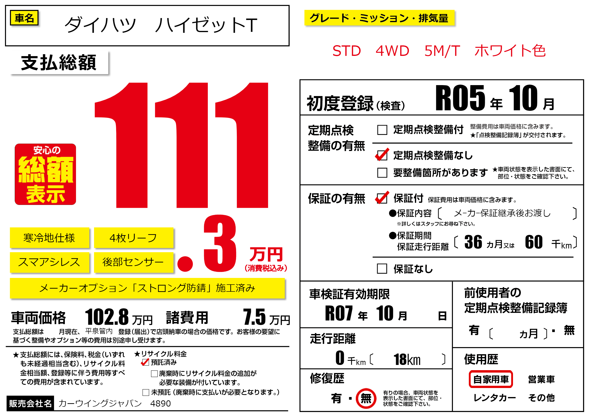 | 車名 | ダイハツ ハイゼットT | グレード ミッション 排気量 |