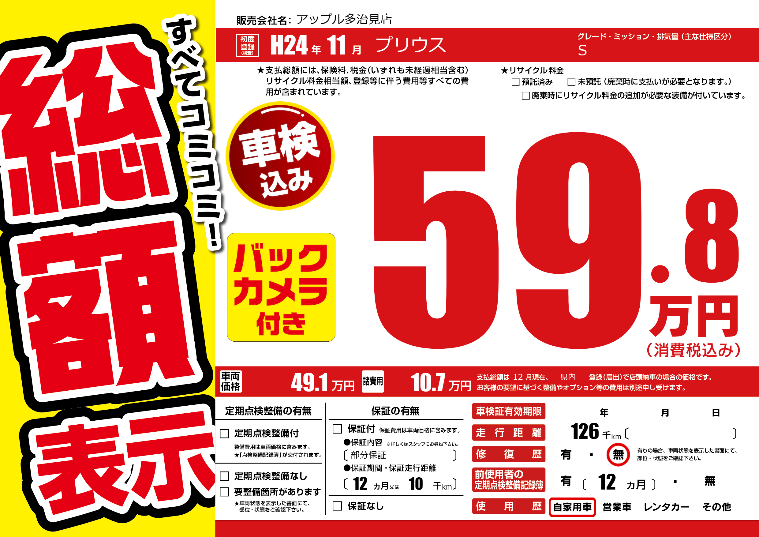 | 車名 | プリウス | グレード ミッション 排気量 |