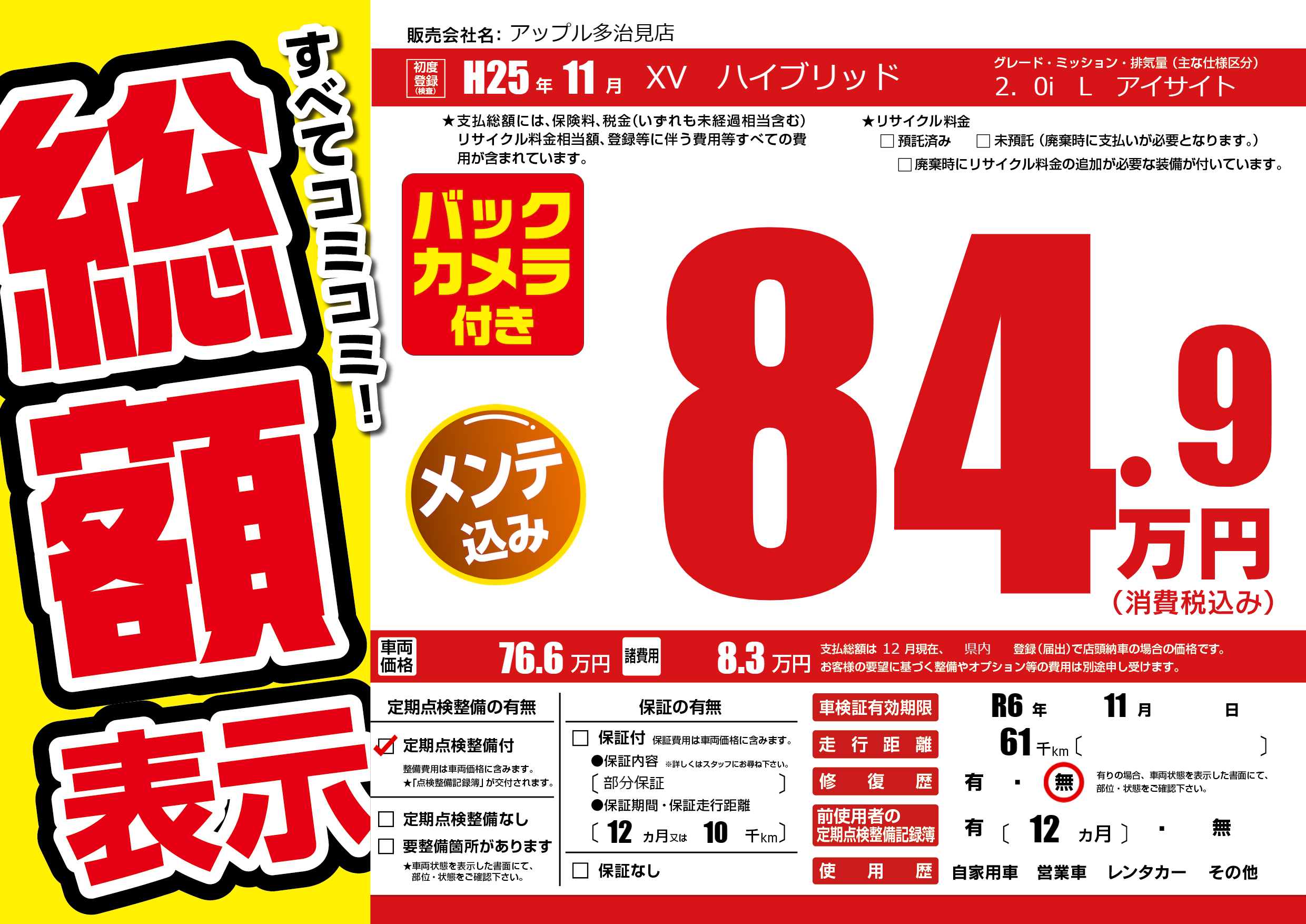 | 走行キロ | 6.1万km | 初年度登録 | H25年11月 |