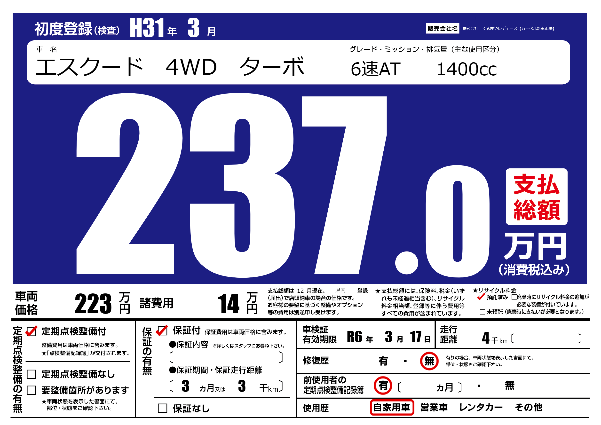 | 走行キロ | 0.4万km | 初年度登録 | H31年3月 |