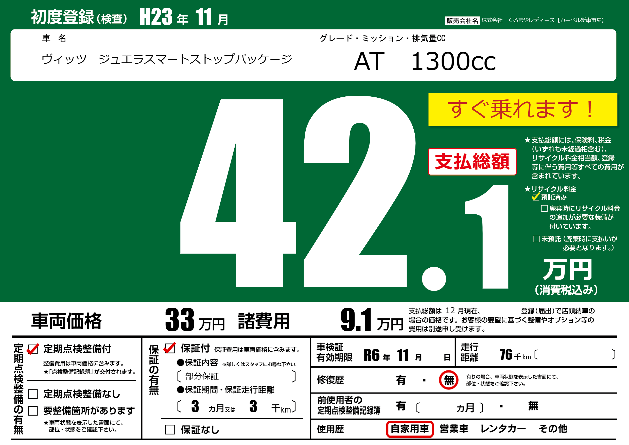 | 走行キロ | 7.6万km | 初年度登録 | H23年11月 |