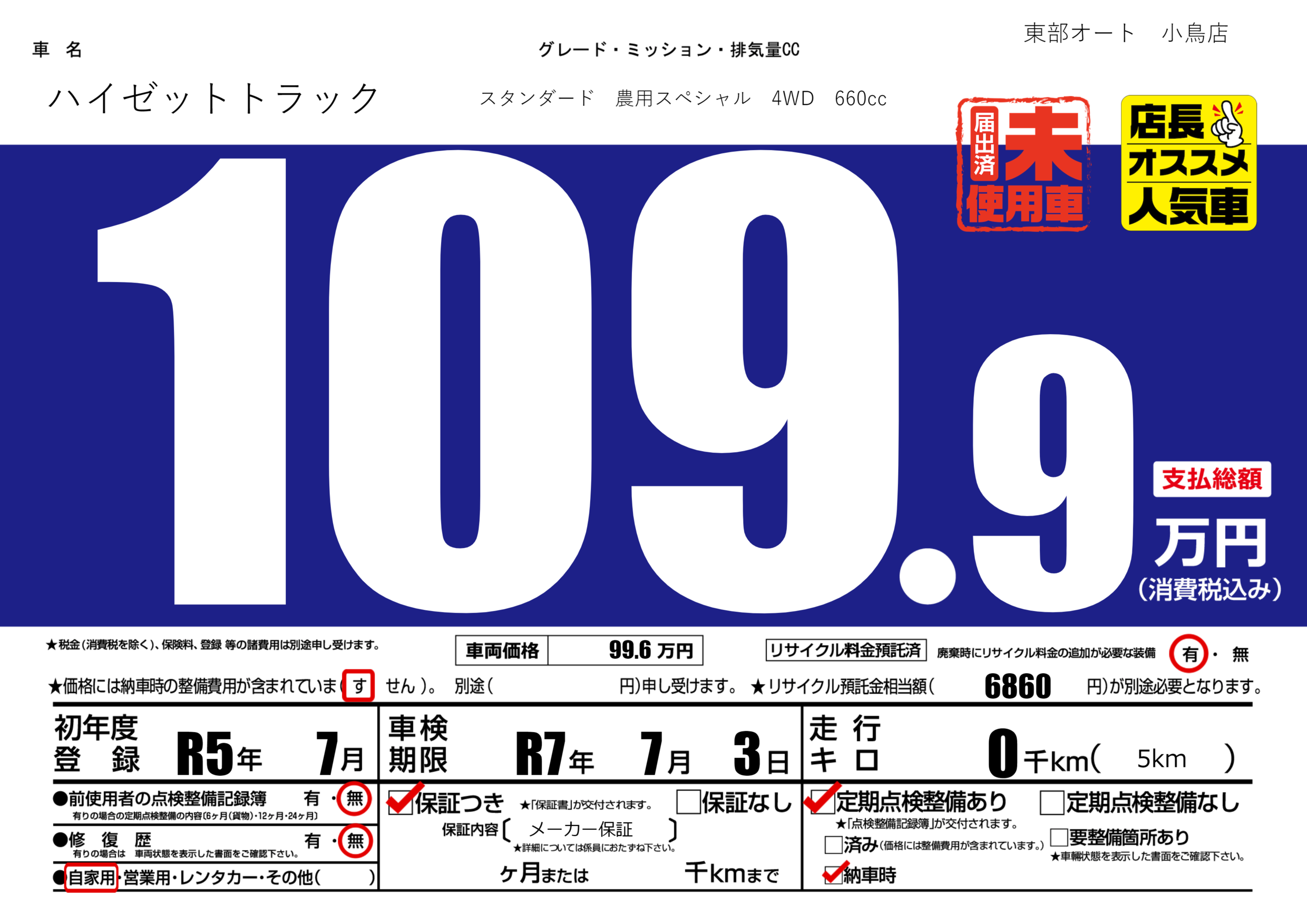 | 定期点検整備 | 定期点検整備あり 納車時あり | ||