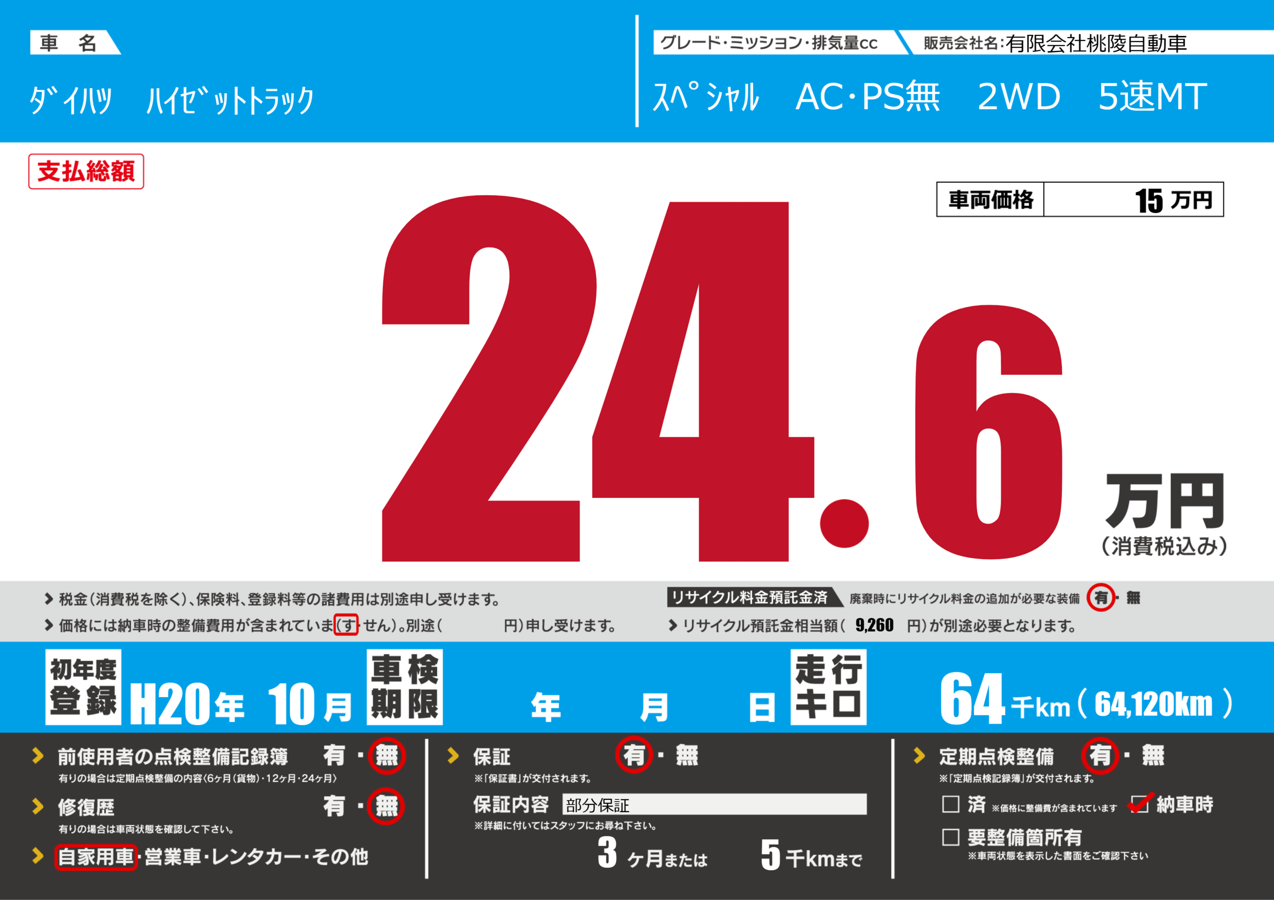 保証付き 保証内容(部分保証) 3ヶ月または(5)千kmまで |