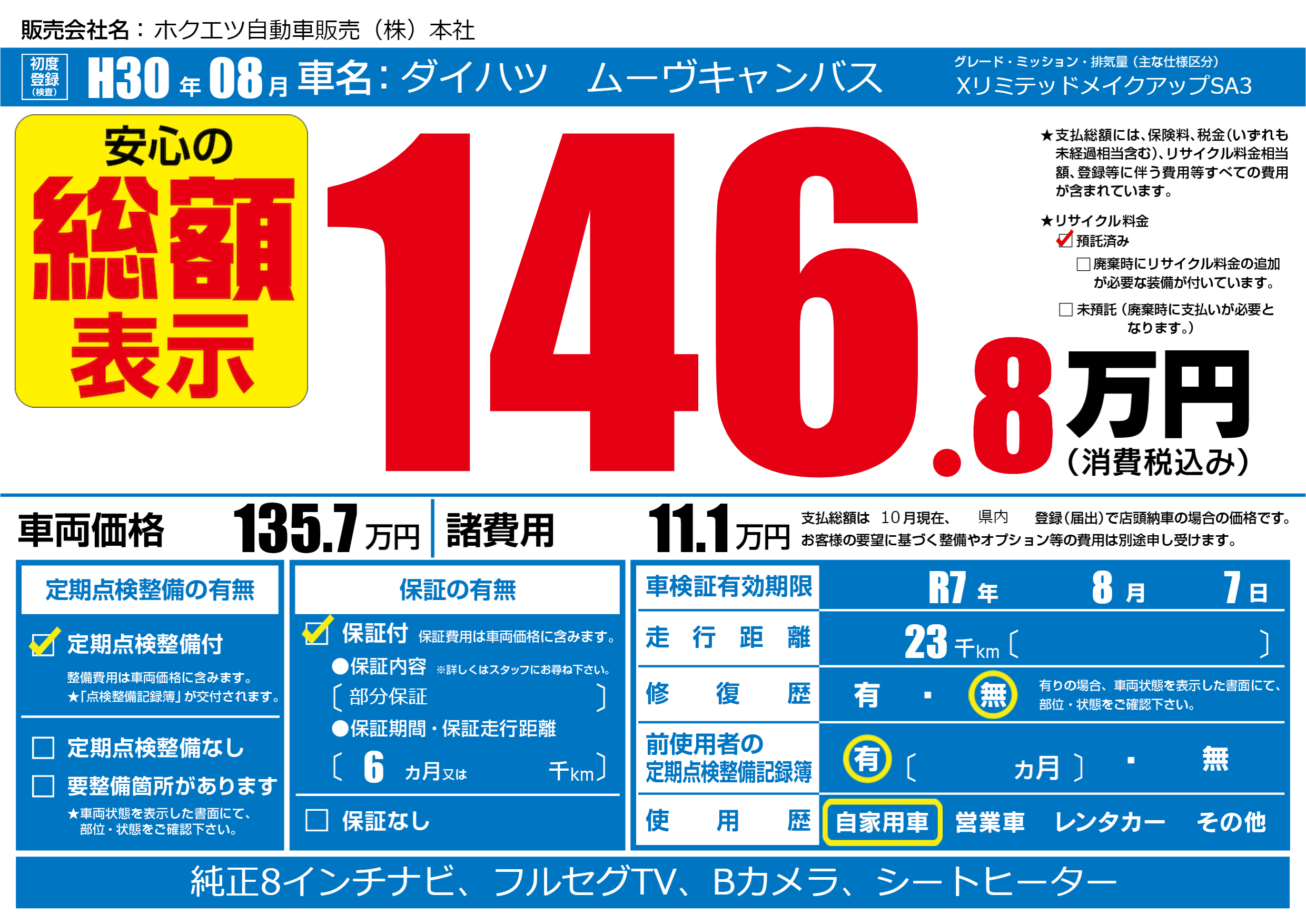 | 走行キロ | 2.3万km | 初年度登録 | H30年08月 |