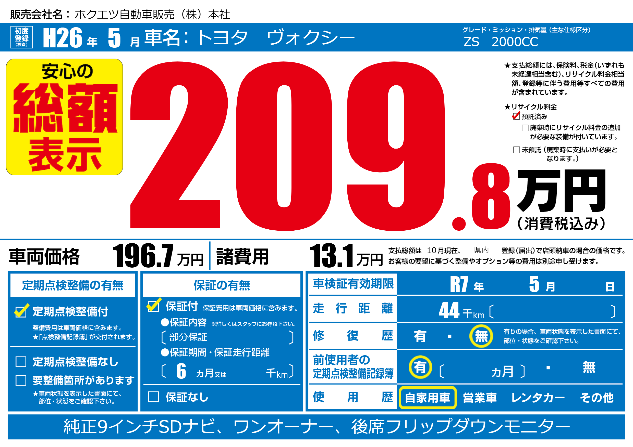 | 車名 | トヨタ ヴォクシー | グレード ミッション 排気量 |