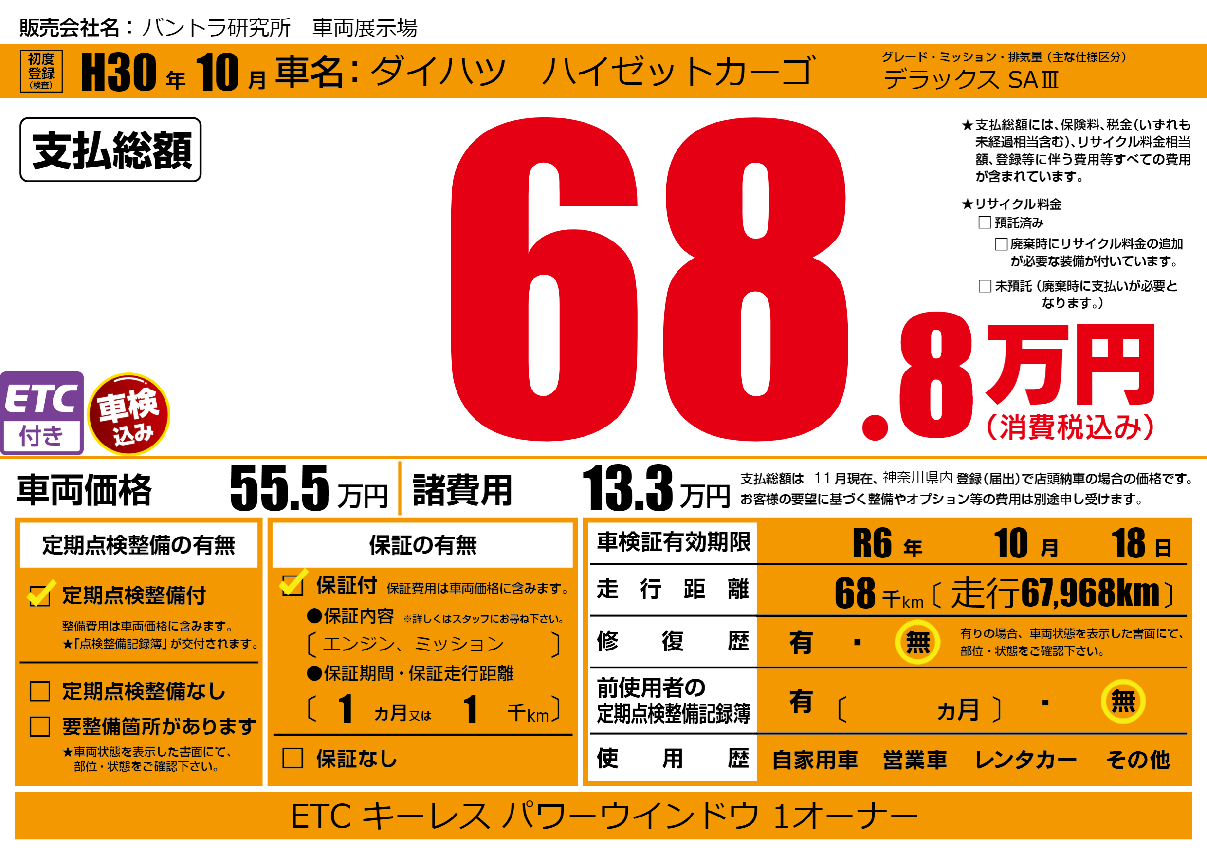 | 車名 | ダイハツ ハイゼットカーゴ | グレード ミッション 排気量 |