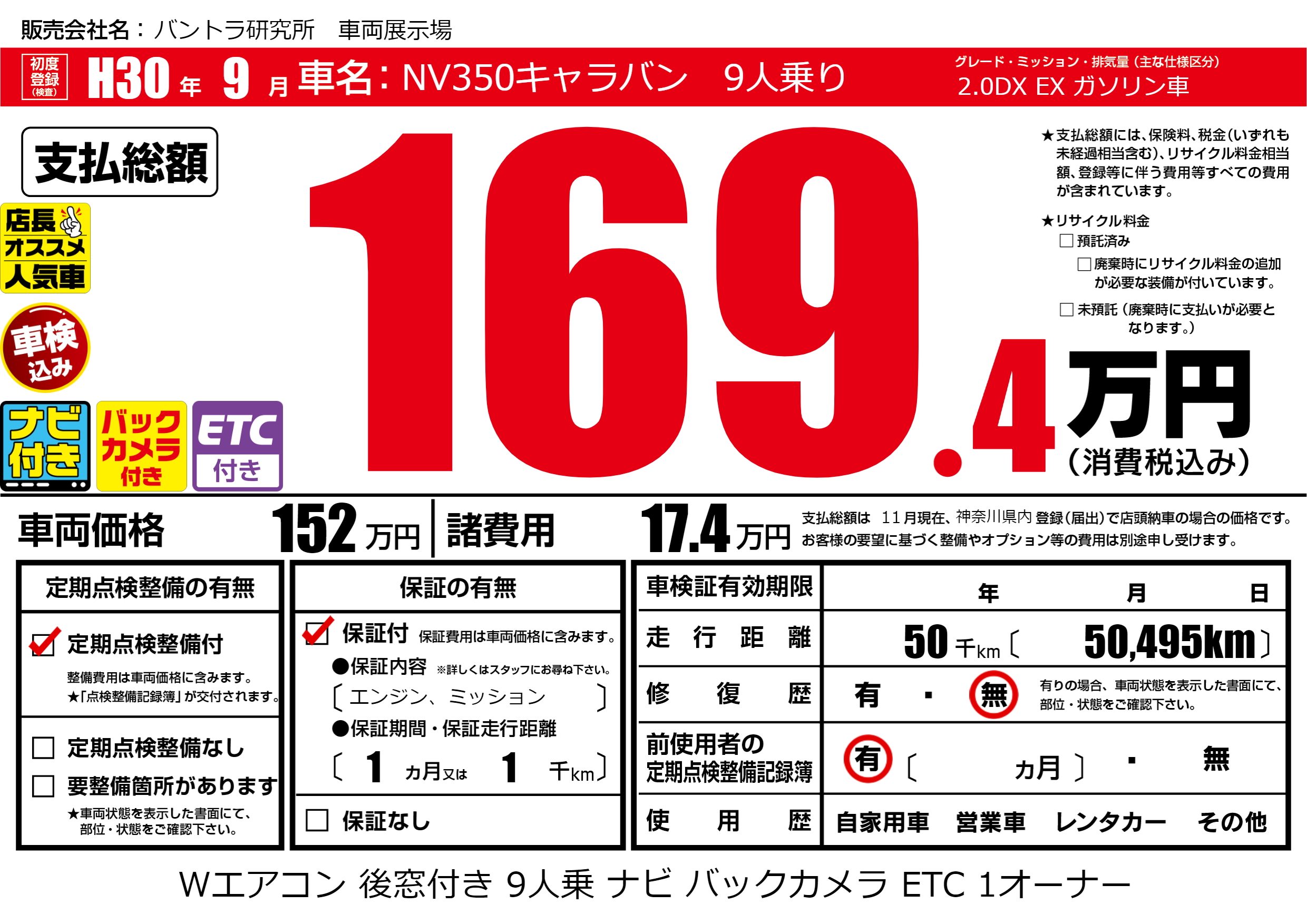 | 車名 | NV350キャラバン 9人乗り | グレード ミッション 排気量 |