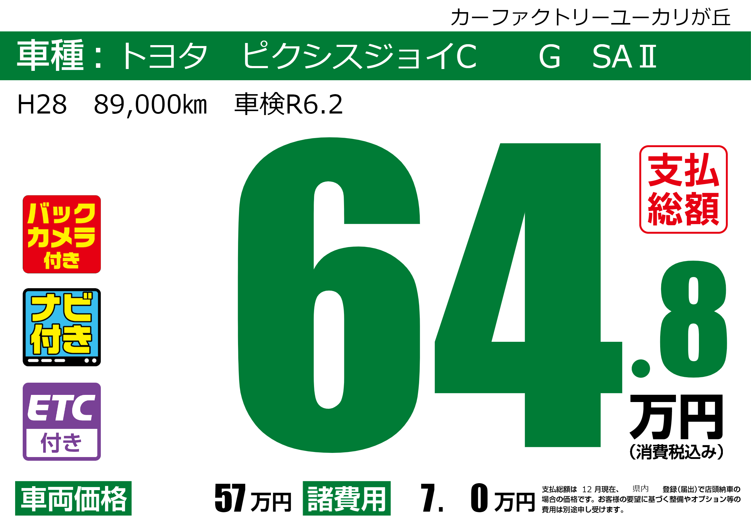 | 車名 | トヨタ ピクシスジョイC G SAⅡ | グレード ミッション 排気量 |