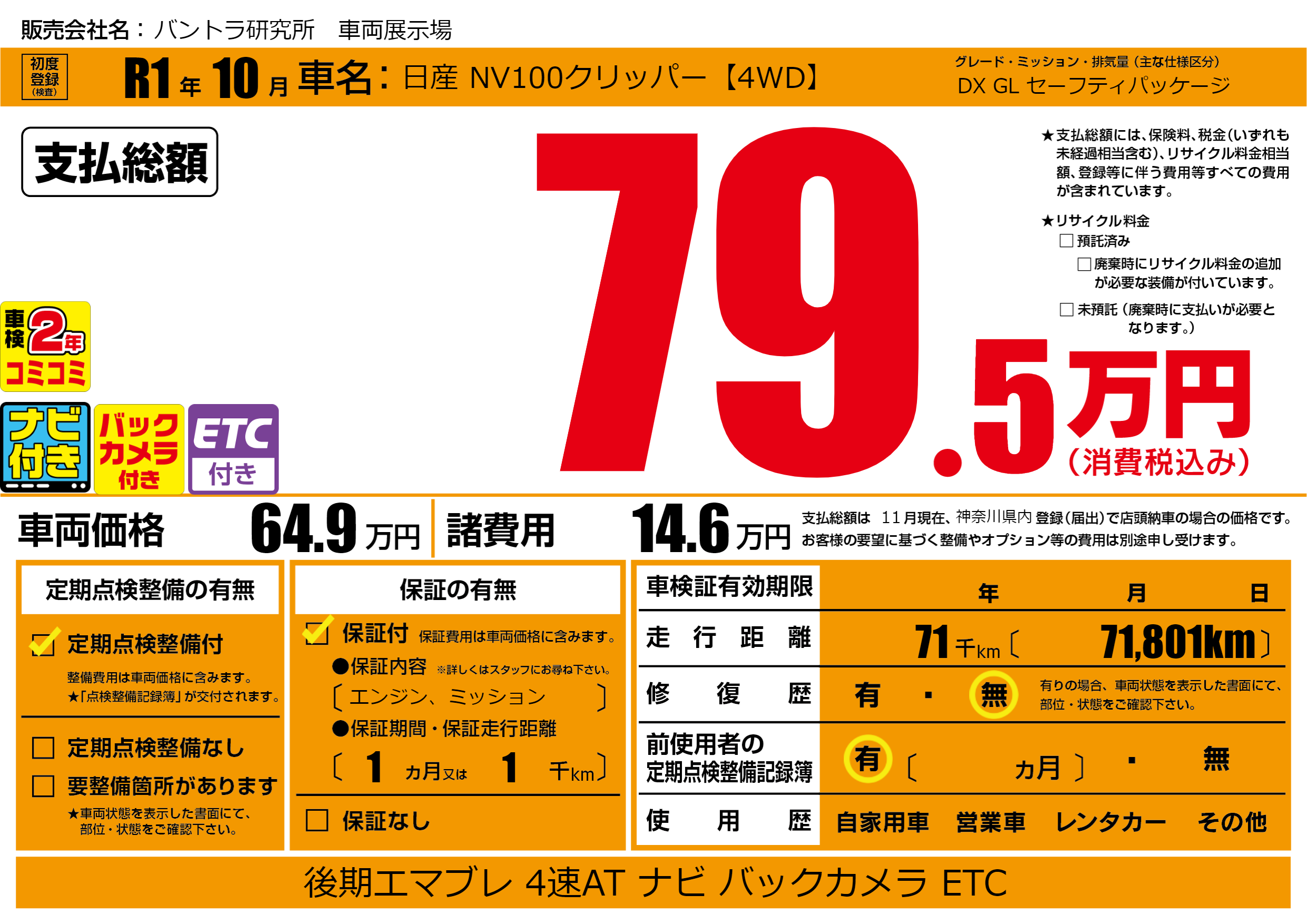 | 車名 | 日産 NV100クリッパー【4WD】 | グレード ミッション 排気量 |