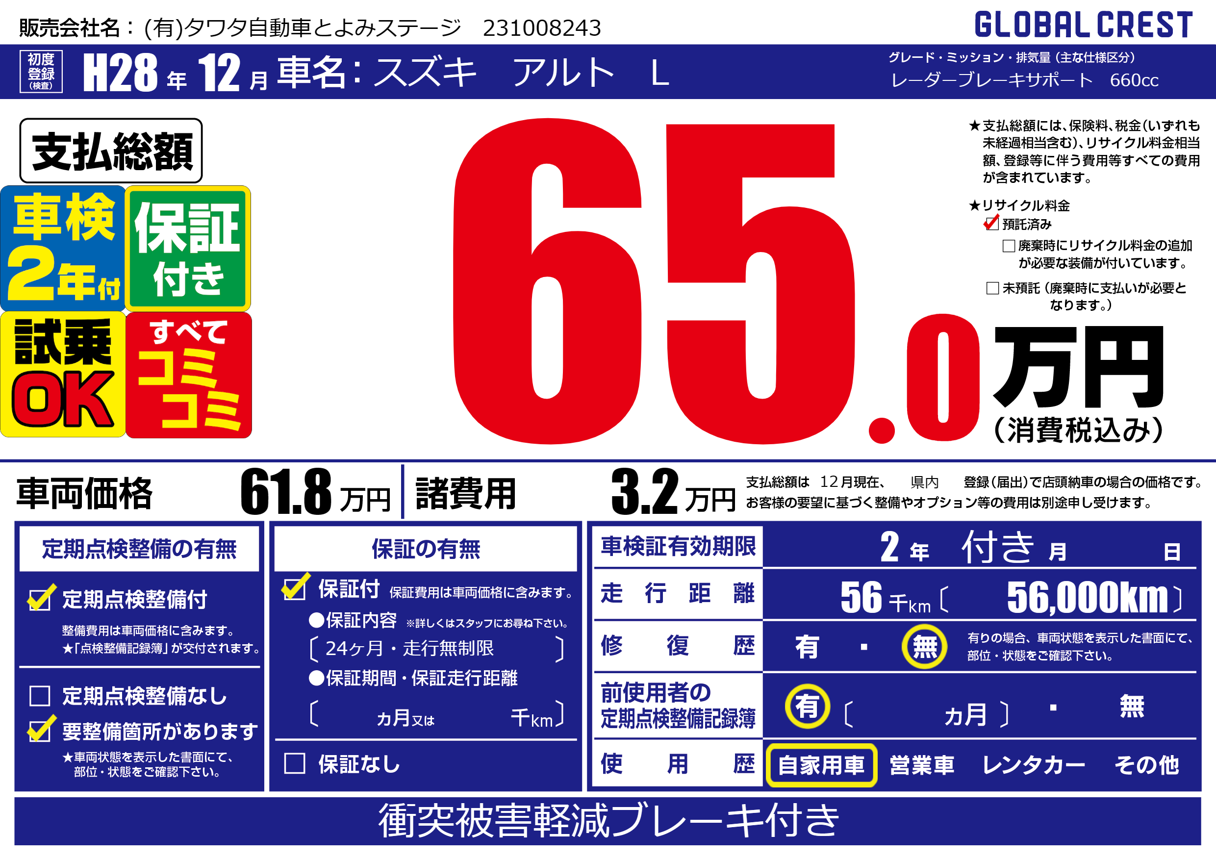 | 走行キロ | 5.6万km | 初年度登録 | H28年12月 |