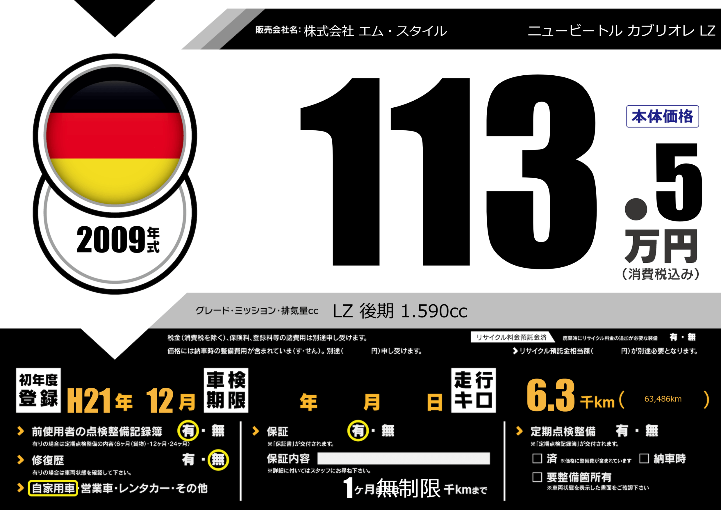 | 車名 | ニュービートル カブリオレ LZ | グレード ミッション 排気量 |