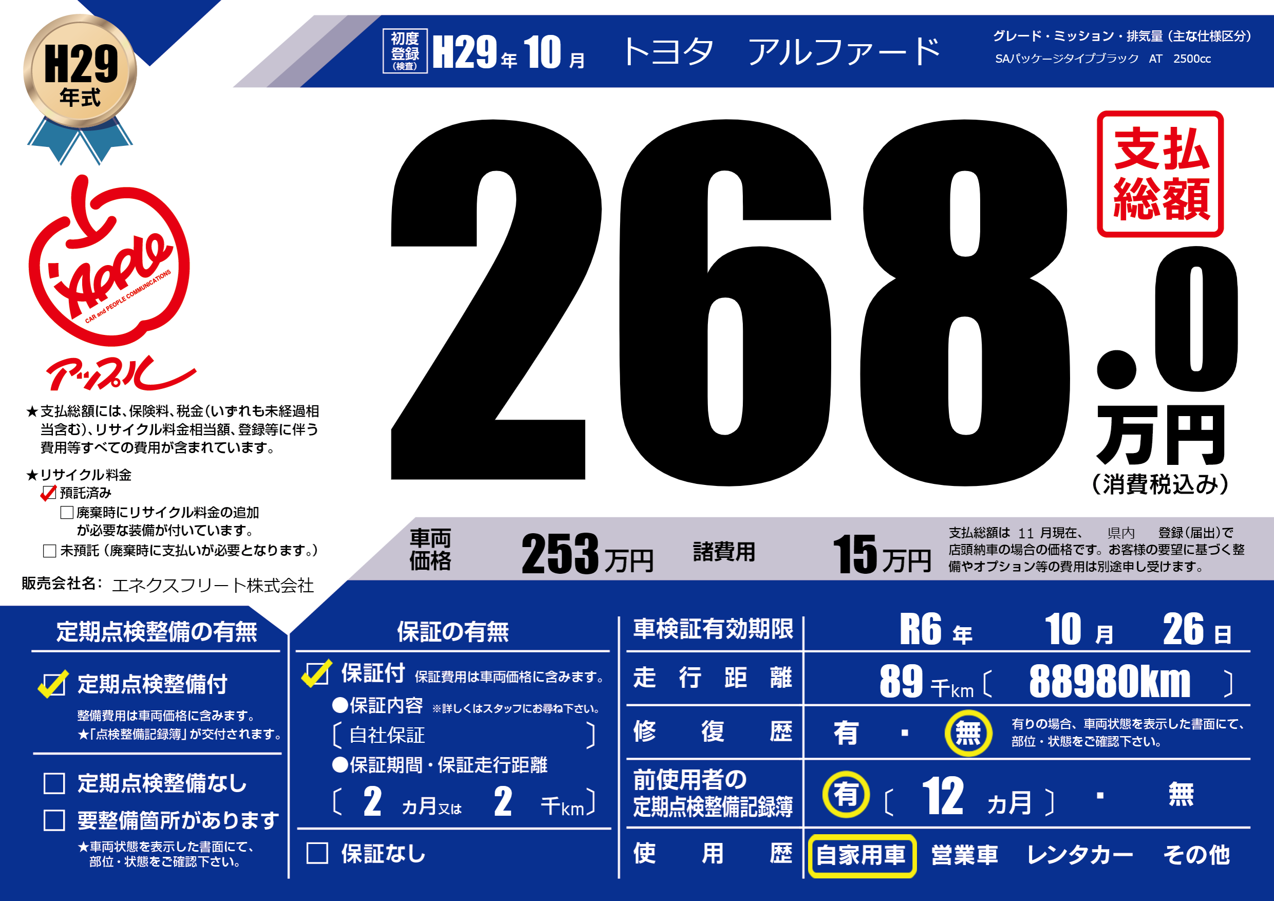 | 車名 | トヨタ アルファード | グレード ミッション 排気量 |