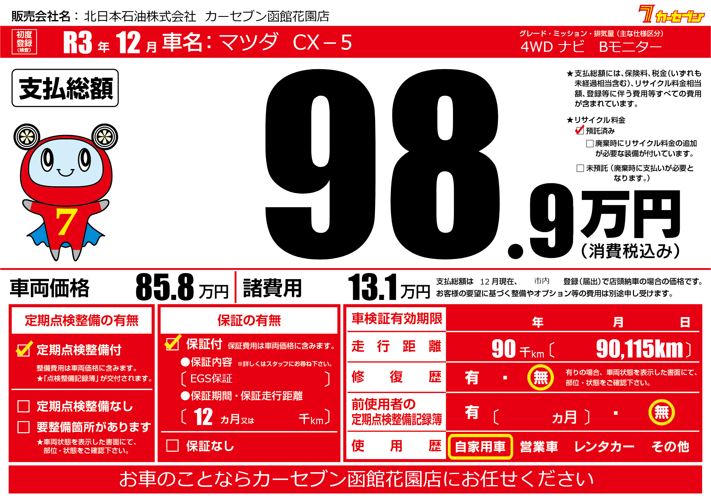| 走行キロ | 9万km | 初年度登録 | R3年12月 |