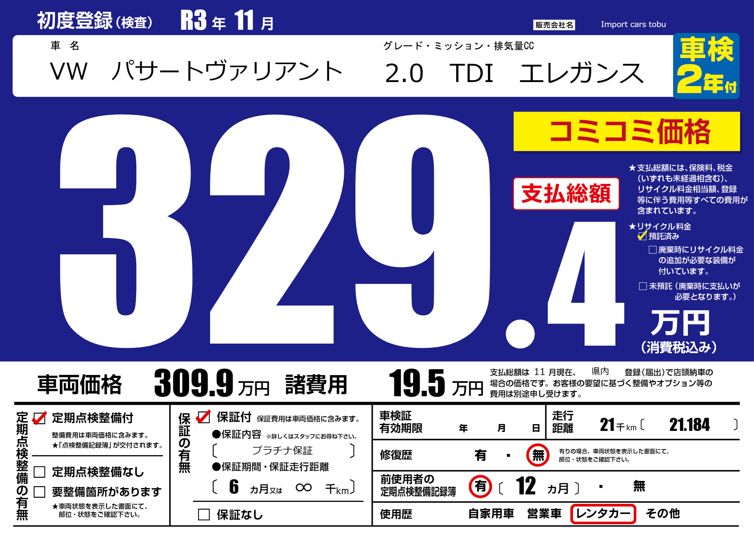 | 車名 | VW パサートヴァリアント | グレード ミッション 排気量 |