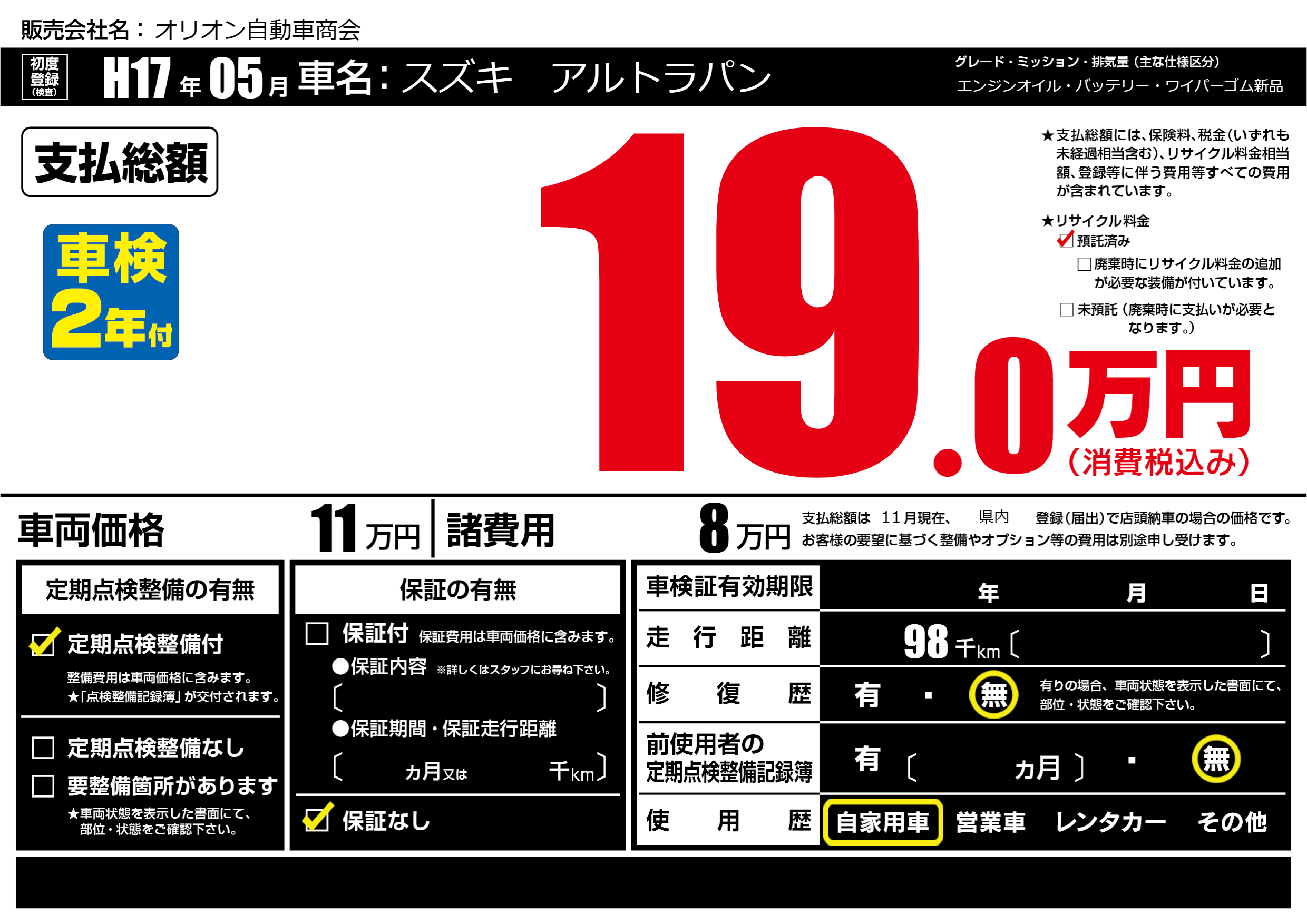 | 走行キロ | 9.8万km | 初年度登録 | H17年05月 |