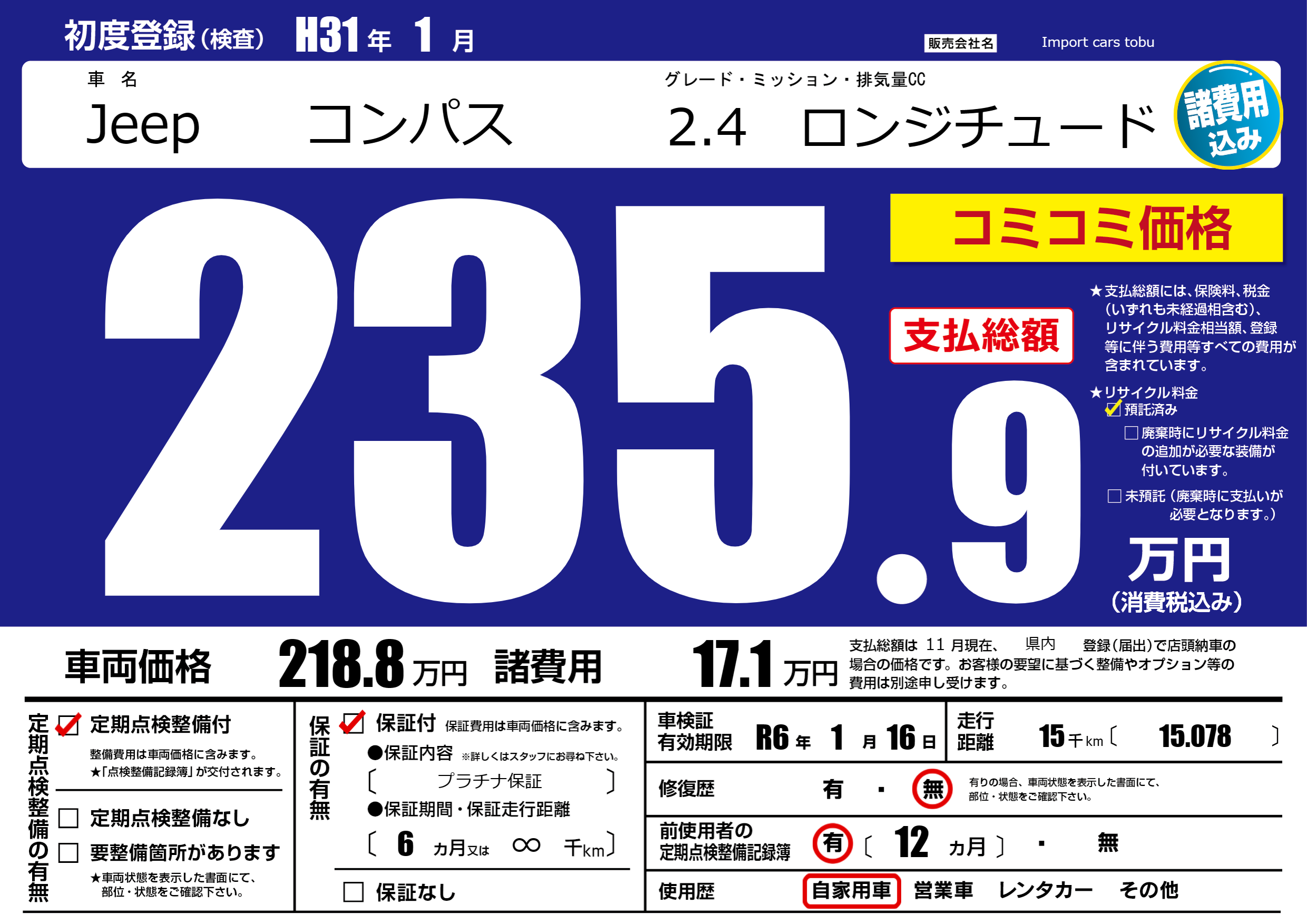 保証付き 保証内容( プラチナ保証) 6ヶ月または(∞)千kmまで |