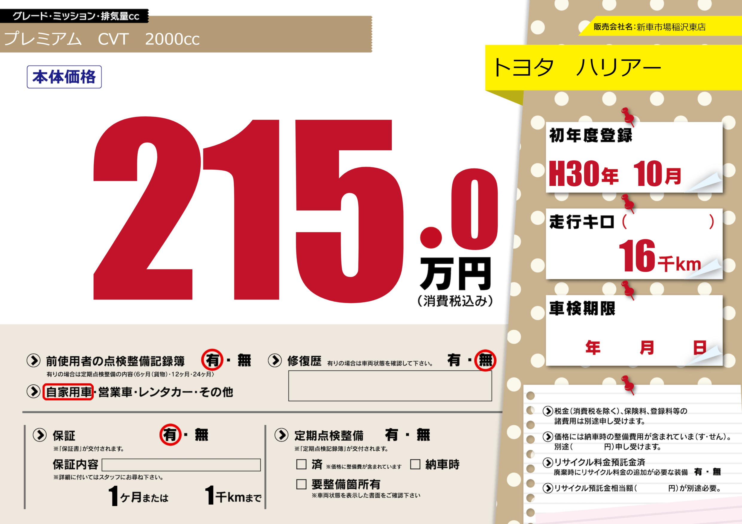保証付き 保証内容(---) 1ヶ月または(1)千kmまで |