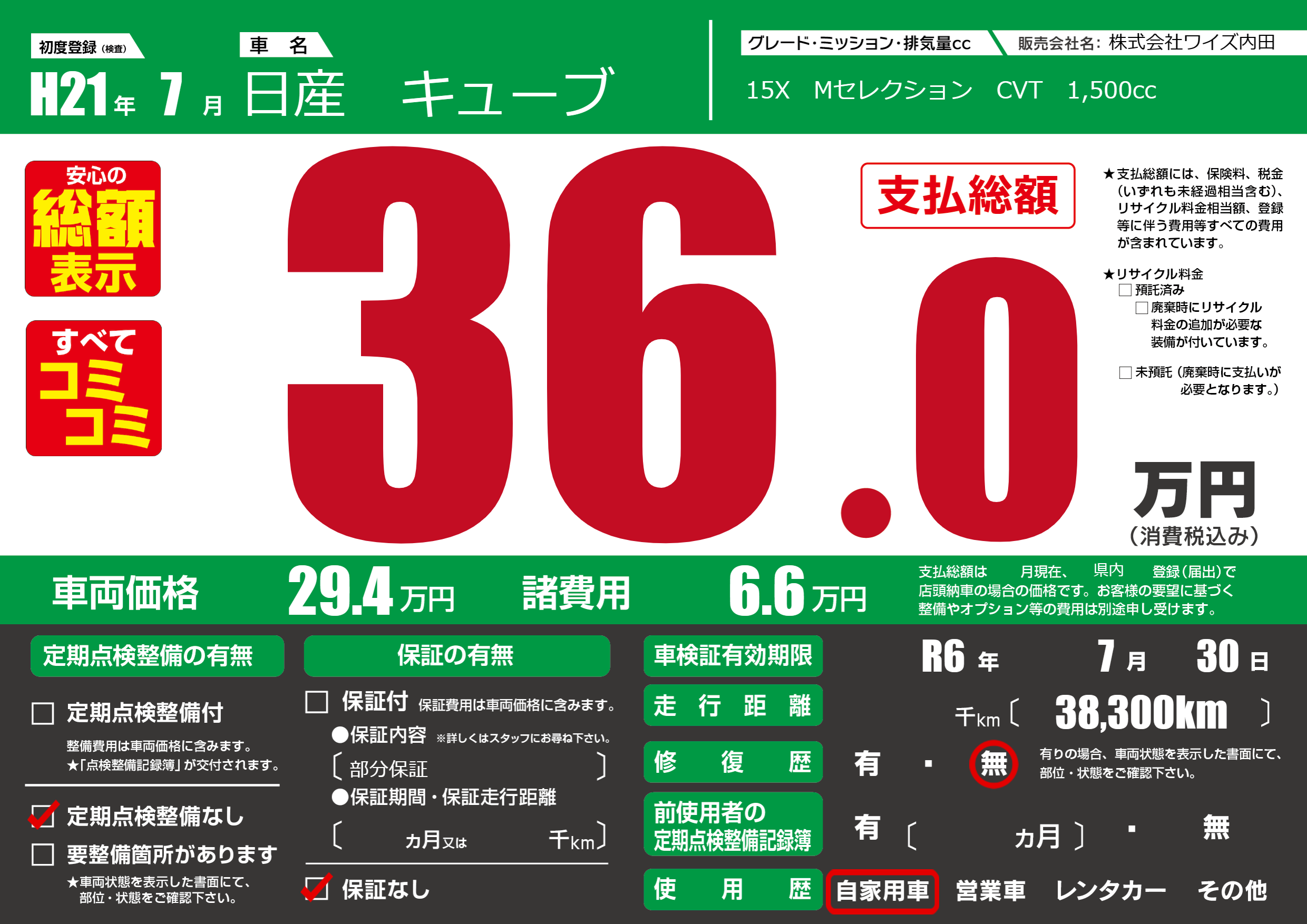 なし | 車検制限 | R6年7月30月 |