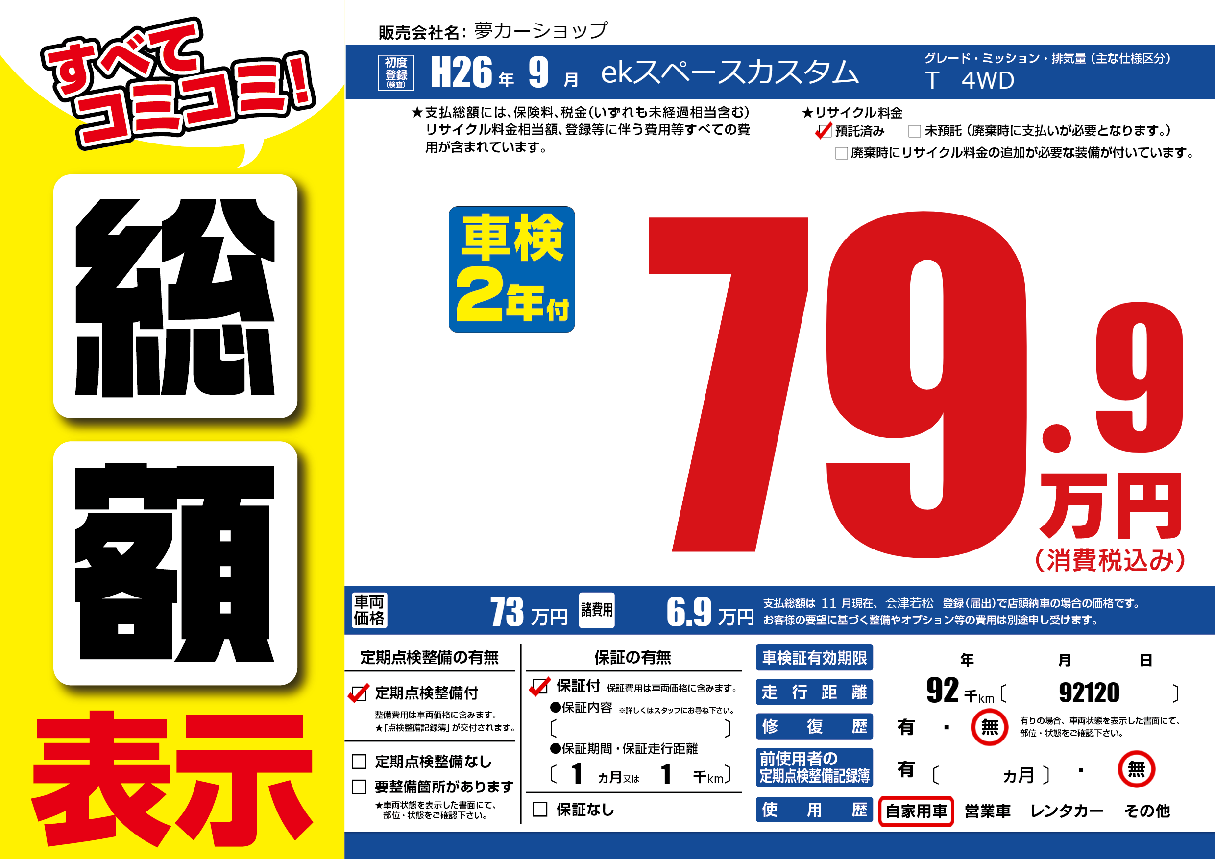 | 走行キロ | 9.2万km | 初年度登録 | H26年9月 |