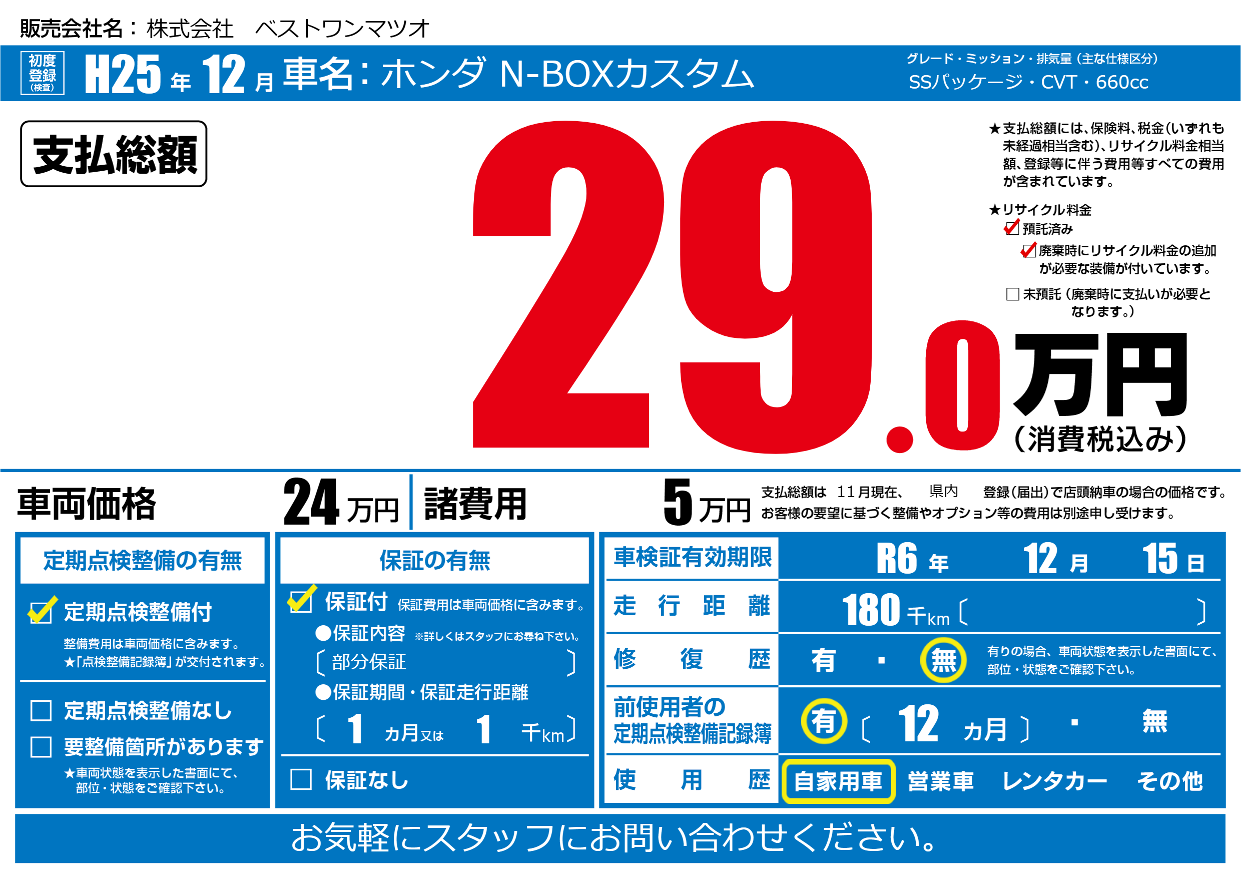 | 車名 | ホンダ N-BOXカスタム | グレード ミッション 排気量 |