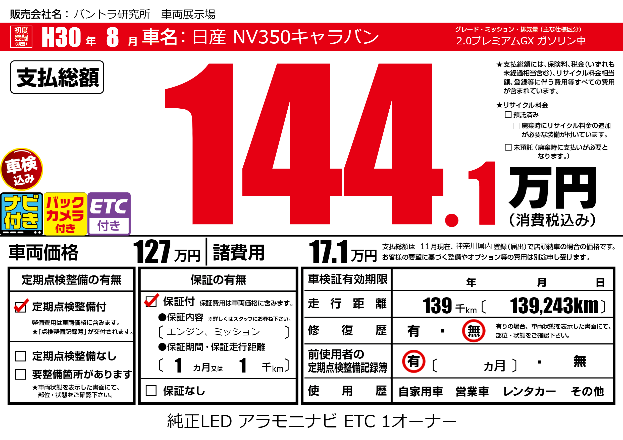 | 走行キロ | 13.9万km | 初年度登録 | H30年8月 |